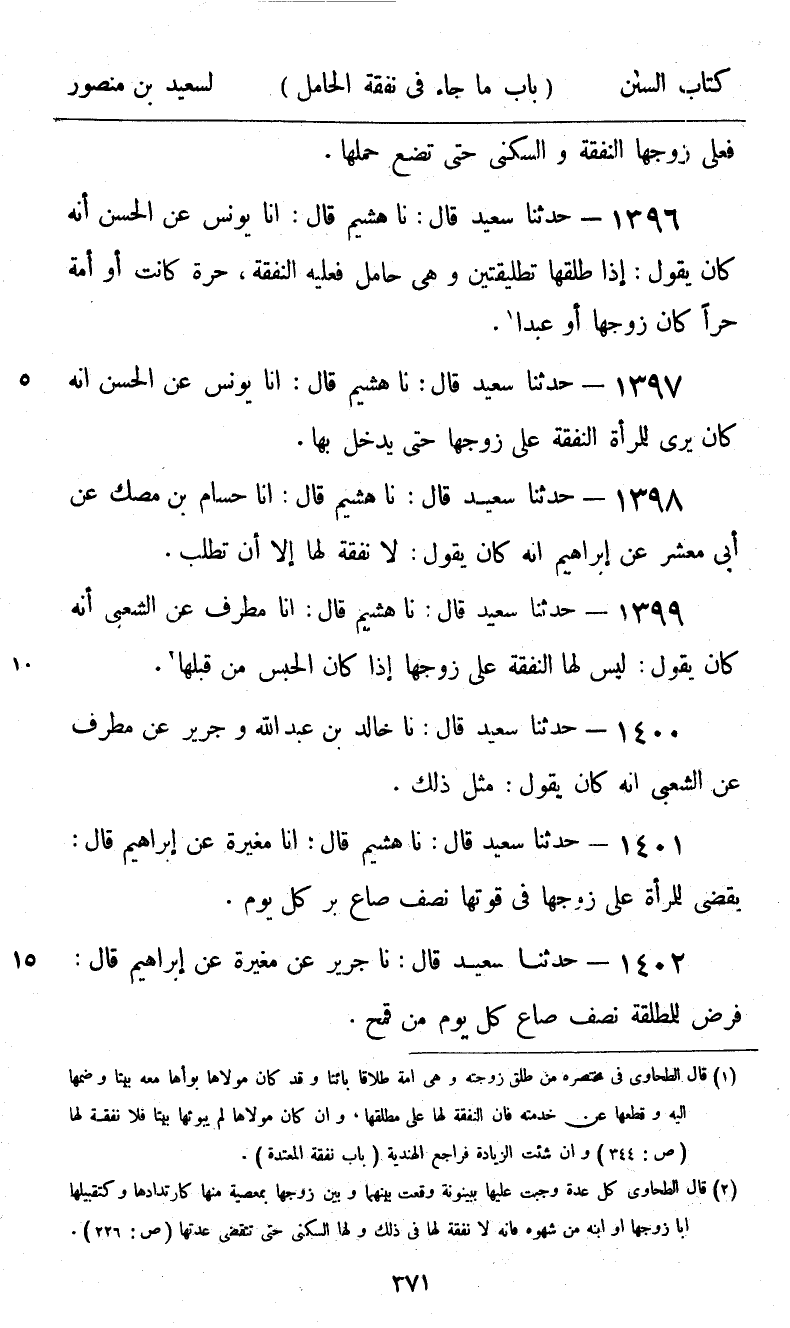 1396 - حَدَّثَنَا سَعِيدٌ قَالَ: نا هُشَيْمٌ، قَالَ: أنا يُونُسُ، عَنِ الْحَسَنِ، أَنَّهُ كَانَ يَقُولُ: «§إِذَا طَلَّقَهَا تَطْلِيقَتَيْنِ وَهِيَ حَامِلٌ فَعَلَيْهِ النَّفَقَةُ، حُرَّةً كَانَتْ أَوْ أَمَةً، حُرًّا كَانَ زَوْجُهَا أَوْ عَبْدًا»
