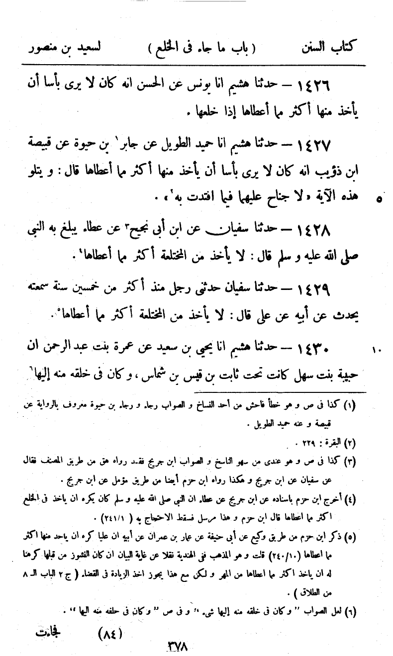 1427 - حَدَّثَنَا هُشَيْمٌ، أنا حُمَيْدٌ الطَّوِيلُ، عَنْ رَجَاءِ بْنِ حَيْوَةَ، عَنْ قَبِيصَةَ بْنِ ذُؤَيْبٍ، " أَنَّهُ §كَانَ لَا يَرَى بَأْسًا أَنْ يَأْخُذَ مِنْهَا أَكْثَرَ مِمَّا أَعْطَاهَا. قَالَ: وَيَتْلُو هَذِهِ الْآيَةَ: {فَلَا جُنَاحَ عَلَيْهِمَا فِيمَا افْتَدَتْ بِهِ} [البقرة: 229]