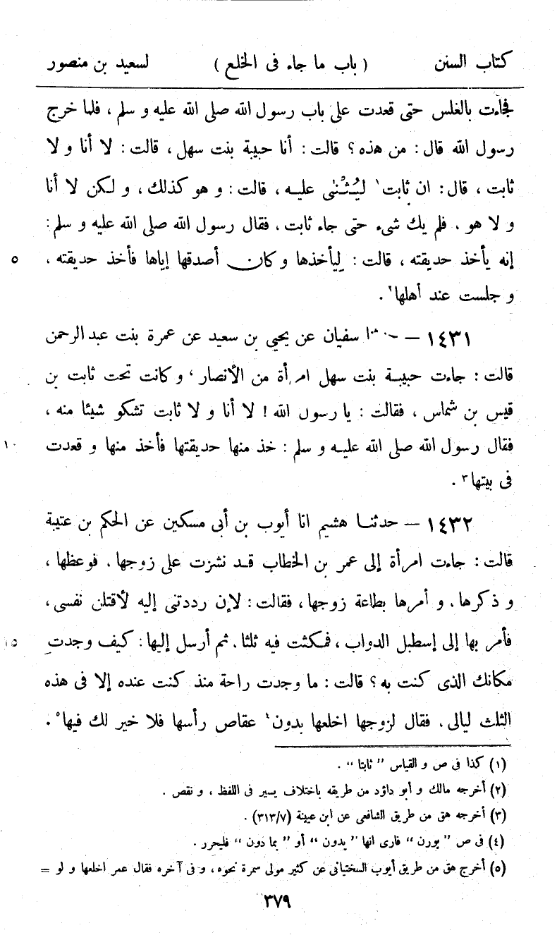 1431 - حَدَّثَنَا سُفْيَانُ، عَنْ يَحْيَى بْنِ سَعِيدٍ، عَنْ عَمْرَةَ بِنْتِ عَبْدِ الرَّحْمَنِ، قَالَتْ: جَاءَتْ حَبِيبَةُ بِنْتُ سَهْلٍ - امْرَأَةٌ مِنَ الْأَنْصَارِ، وَكَانَتْ تَحْتَ ثَابِتِ بْنِ قَيْسِ بْنِ شَمَّاسٍ - فَقَالَتْ: يَا رَسُولَ اللَّهِ، لَا أَنَا وَلَا ثَابِتٌ. تَشْكُو شَيْئًا مِنْهُ، فَقَالَ رَسُولُ اللَّهِ صَلَّى اللهُ عَلَيْهِ وَسَلَّمَ: «§خُذْ مِنْهَا حَدِيقَتَهَا» . فَأَخَذَ مِنْهَا، وَقَعَدَتْ فِي بَيْتِهَا