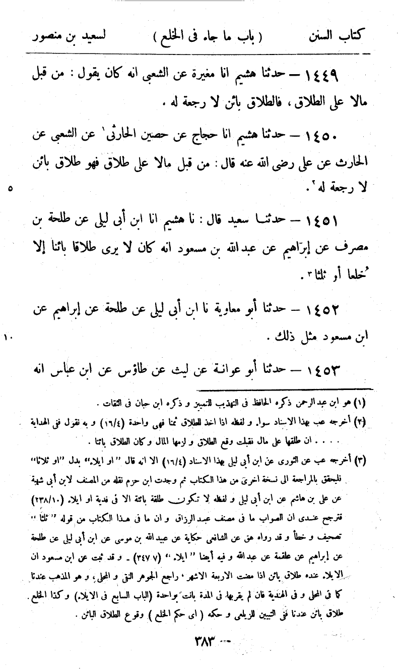 1451 - حَدَّثَنَا سَعِيدٌ قَالَ: نا هُشَيْمٌ، أنا ابْنُ أَبِي لَيْلَى، عَنْ طَلْحَةَ بْنِ مُصَرِّفٍ، عَنْ إِبْرَاهِيمَ، عَنْ عَبْدِ اللَّهِ بْنِ مَسْعُودٍ، «أَنَّهُ §كَانَ لَا يَرَى طَلَاقًا بَائِنًا إِلَّا خُلْعًا أَوْ ثَلَاثًا» .