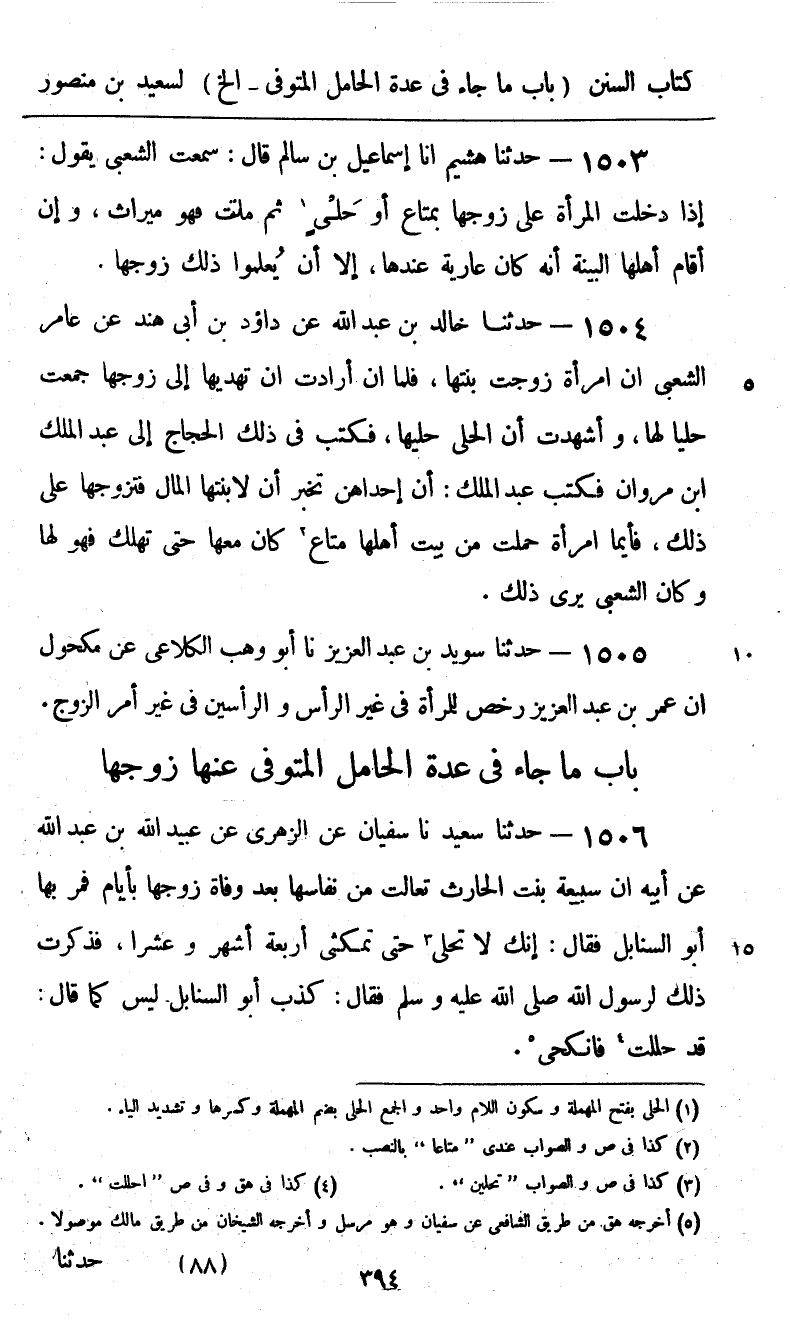 1506 - حَدَّثَنَا سَعِيدٌ، نا سُفْيَانُ، عَنِ الزُّهْرِيِّ، عَنْ عُبَيْدِ اللَّهِ بْنِ عَبْدِ اللَّهِ، عَنْ أَبِيهِ، " أَنَّ سُبَيْعَةَ بِنْتَ الْحَارِثِ، تَعَالَتْ مِنْ نِفَاسِهَا بَعْدَ وَفَاةِ زَوْجِهَا بِأَيَّامٍ، فَمَرَّ بِهَا أَبُو السَّنَابِلِ فَقَالَ: إِنَّكَ لَا تَحِلِّينَ حَتَّى تَمْكُثِي أَرْبَعَةَ أَشْهُرٍ وَعَشْرًا، فَذَكَرَتْ ذَلِكَ لِرَسُولِ اللَّهِ صَلَّى اللهُ عَلَيْهِ وَسَلَّمَ فَقَالَ: «كَذَبَ أَبُو السَّنَابِلِ لَيْسَ كَمَا قَالَ، §قَدْ حَلَلْتِ فَانْكِحِي»