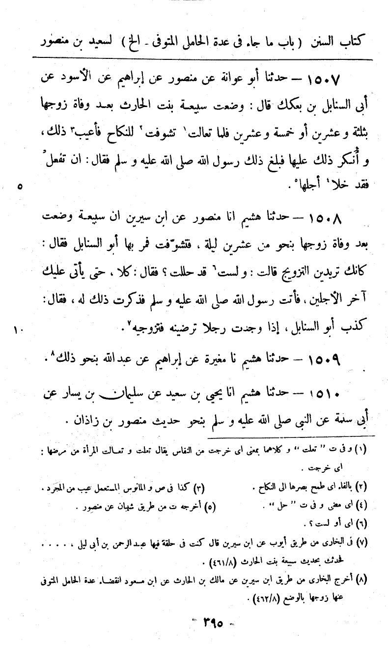 1508 - حَدَّثَنَا هُشَيْمٌ، أنا مَنْصُورٌ، عَنِ ابْنِ سِيرِينَ أَنَّ سُبَيْعَةَ وَضَعَتْ بَعْدَ وَفَاةِ زَوْجِهَا بِنَحْو مِنْ عِشْرِينَ لَيْلَةً، فَتَشَوَّفَتْ فَمَرَّ بِهَا أَبُو السَّنَابِلِ فَقَالَ: كَأَنَّكِ تُرِيدِينَ التَّزْوِيجَ قَالَتْ: وَلَسْتُ قَدْ حَلَلْتُ؟ فَقَالَ: كَلَّا، حَتَّى يَأْتِيَ عَلَيْكِ آخِرُ الْأَجَلَيْنِ، فَأَتَتْ رَسُولَ اللَّهِ صَلَّى اللهُ عَلَيْهِ وَسَلَّمَ فَذَكَرَتْ ذَلِكَ لَهُ فَقَالَ: «كَذَبَ أَبُو السَّنَابِلِ، §إِذَا وَجَدْتِ رَجُلًا تَرْضِينَهُ فَتَزَوَّجِيهِ» .