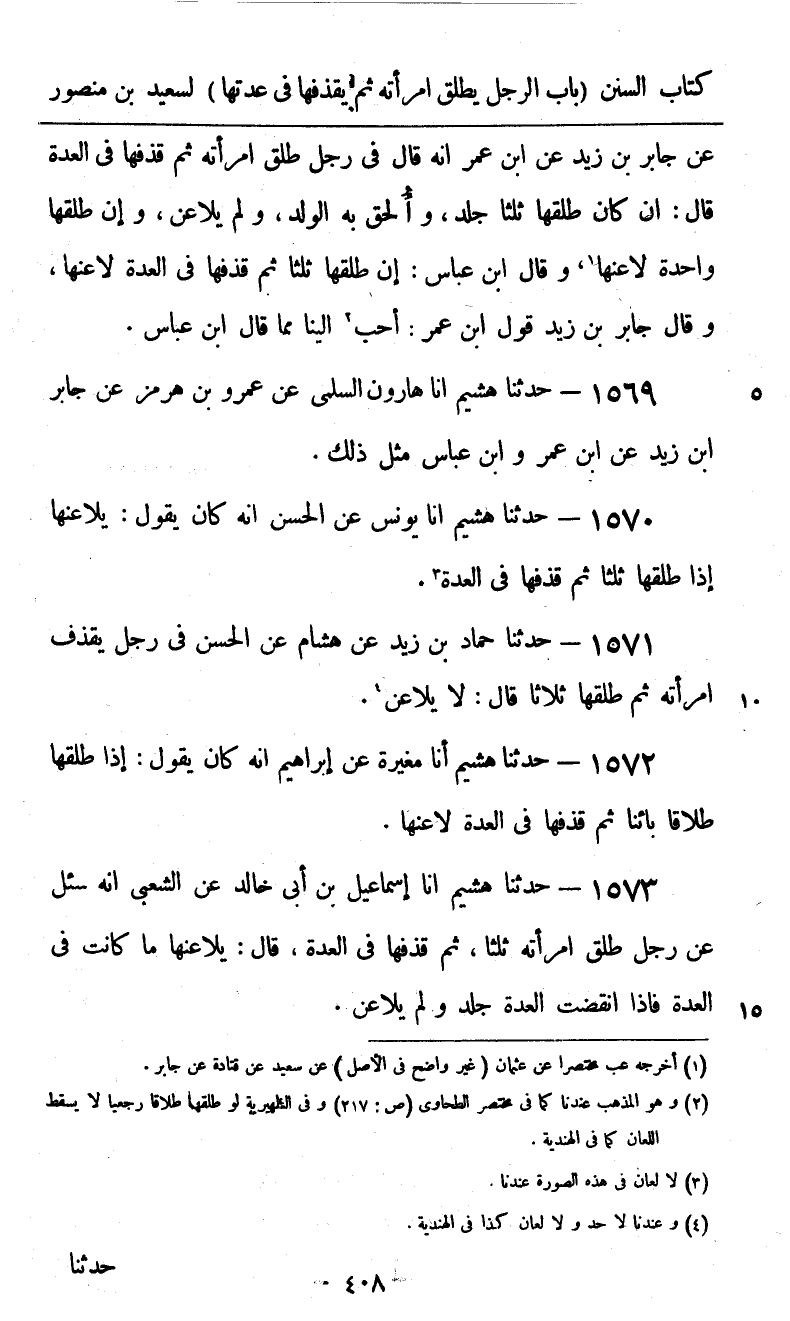 1573 - حَدَّثَنَا هُشَيْمٌ، أنا إِسْمَاعِيلُ بْنُ أَبِي خَالِدٍ، عَنِ الشَّعْبِيِّ، أَنَّهُ سُئِلَ عَنْ رَجُلٍ، طَلَّقَ امْرَأَتَهُ ثَلَاثًا، ثُمَّ قَذَفَهَا فِي الْعِدَّةِ قَالَ: «§يُلَاعِنُهَا مَا كَانَتْ فِي الْعِدَّةِ فَإِذَا انْقَضَتِ الْعِدَّةُ جُلِدَ وَلَمْ يُلَاعِنْ»