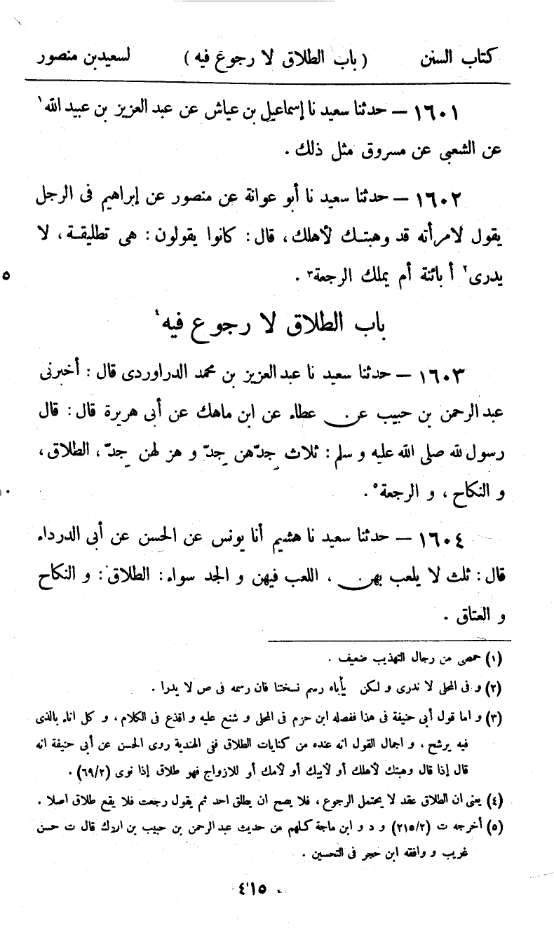 1603 - حَدَّثَنَا سَعِيدٌ، نا عَبْدُ الْعَزِيزِ بْنُ مُحَمَّدٍ الدَّرَاوَرْدِيُّ، قَالَ: أَخْبَرَنِي عَبْدُ الرَّحْمَنِ بْنُ حَبِيبٍ، عَنْ عَطَاءٍ، عَنِ ابْنِ مَاهَكٍ، عَنْ أَبِي هُرَيْرَةَ، قَالَ: قَالَ رَسُولُ اللَّهِ صَلَّى اللهُ عَلَيْهِ وَسَلَّمَ: «§ثَلَاثٌ جِدُّهُنَّ جِدٌّ، وَهَزْلُهُنَّ جِدٌّ، الطَّلَاقُ، وَالنِّكَاحُ، وَالرَّجْعَةُ»