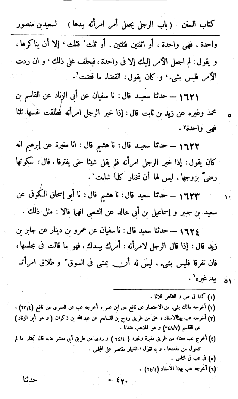 1621 - حَدَّثَنَا سَعِيدٌ قَالَ: نا سُفْيَانُ، عَنْ أَبِي الزِّنَادِ، عَنِ الْقَاسِمِ بْنِ مُحَمَّدٍ وَغَيْرِهِ، عَنْ زَيْدِ بْنِ ثَابِتٍ، قَالَ: «§إِذَا خَيَّرَ الرَّجُلُ امْرَأَتَهُ فَطَلَّقَتْ نَفْسَهَا ثَلَاثًا فَهِيَ وَاحِدَةٌ»