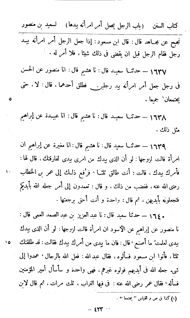 1637 - حَدَّثَنَا سَعِيدٌ قَالَ: نا هُشَيْمٌ، قَالَ: أنا مَنْصُورٌ، عَنِ الْحَسَنِ، فِي رَجُلٍ جَعَلَ أَمْرَ امْرَأَتِهِ بِيَدِ رَجُلَيْنِ فَطَلَّقَ أَحَدُهُمَا قَالَ: «§لَا، حَتَّى يَجْتَمِعَا جَمِيعًا» .