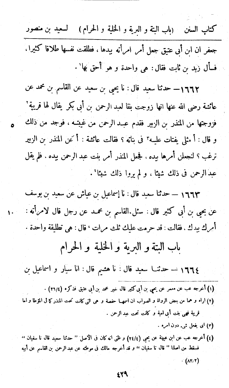 1664 - حَدَّثَنَا سَعِيدٌ قَالَ: نا هُشَيْمٌ، قَالَ: أنا سَيَّارٌ، وَإِسْمَاعِيلُ بْنُ -[430]- أَبِي خَالِدٍ، عَنِ الشَّعْبِيِّ، أَنَّ رَجُلًا كَانَ بِسَبِيلٍ مِنْ عُرْوَةَ بْنِ الْمُغِيرَةِ، فَقَالَ لِامْرَأَتِهِ: إِنْ أَتَيْتِ أَهْلَ الْمُغِيرَةِ فَأَنْتِ طَالِقٌ الْبَتَّةَ. فَانْطَلَقَ الرَّجُلُ حَتَّى دَخَلَ عَلَى عُرْوَةَ بْنِ الْمُغِيرَةِ، فَقَالَ عُرْوَةُ: مَرْحَبًا بِكَ أَبَا فُلَانٍ أَتَيْتَنَا، وَقَدْ جَاءَتْنَا أُمُّ بَكْرٍ - يَعْنِي امْرَأَتَهُ. قَالَ: فَإِنَّهُ قَدْ طَلَّقَهَا الْبَتَّةَ، فَأَفْتِنِي. فَأَرْسَلَ عُرْوَةُ يَسْأَلُ عَنْ ذَلِكَ، فَأَخْبَرَهُ عَبْدُ اللَّهِ بْنُ شَدَّادِ بْنِ الْهَادِ عَنْ عُمَرَ رَضِيَ اللَّهُ عَنْهُ أَنَّهُ جَعَلَهَا وَاحِدَةً، وَأَخْبَرَهُ رِيَاشٌ الطَّائِيُّ أَنَّ عَلِيًّا رَضِيَ اللَّهُ عَنْهُ قَالَ: «§هِيَ ثَلَاثٌ» . فَأَرْسَلَ عُرْوَةُ إِلَى شُرَيْحٍ يَسْأَلُهُ عَنْ ذَلِكَ، فَقَالَ شُرَيْحٌ: أَمَّا قَوْلُهُ: طَالِقٌ، فَهِيَ طَالِقٌ بِالسُّنَّةِ، وَأَمَّا قَوْلُهُ: الْبَتَّةَ، فَهِيَ بِدْعَةٌ نَقِفُهُ عِنْدَ بِدْعَتِهِ، فَإِنْ شَاءَ تَقَدَّمَ، وَإِنْ شَاءَ تَأَخَّرَ "