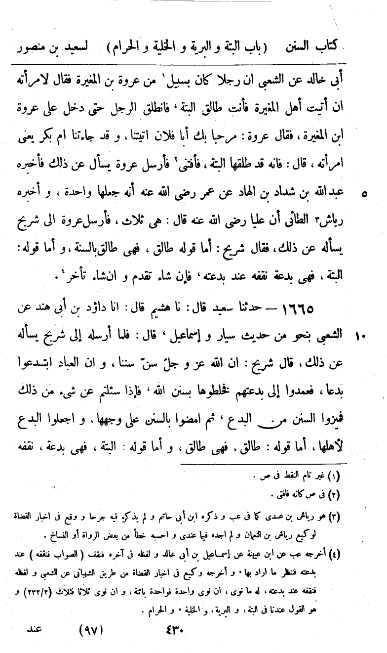 1665 - حَدَّثَنَا سَعِيدٌ قَالَ: نا هُشَيْمٌ، قَالَ: أنا دَاوُدُ بْنُ أَبِي هِنْدَ، عَنِ الشَّعْبِيِّ، بِنَحْوٍ مِنْ حَدِيثِ سَيَّارٍ وَإِسْمَاعِيلَ، قَالَ: فَلَمَّا أَرْسَلَهُ إِلَى شُرَيْحٍ يَسْأَلُهُ عَنْ ذَلِكَ، قَالَ شُرَيْحٌ: إِنَّ اللَّهَ عَزَّ وَجَلَّ سَنَّ سُنَنًا، وَإِنَّ الْعِبَادَ ابْتَدَعُوا بِدَعًا، فَعَمَدُوا إِلَى بِدْعَتِهِمْ فَخَلَطُوهَا بِسُنَنِ اللَّهِ، فَإِذَا سُئِلْتُمْ عَنْ شَيْءٍ مِنْ ذَلِكَ فَمَيِّزُوا السُّنَنَ مِنَ الْبِدَعِ، ثُمَّ امْضُوا بِالسُّنَنِ عَلَى وَجْهِهَا، وَاجْعَلُوا الْبِدَعَ لِأَهْلِهَا، وَأَمَّا §قَوْلُهُ: طَالِقٌ، فَهِيَ طَالِقٌ، وَأَمَّا قَوْلُهُ: الْبَتَّةَ، فَهِيَ بِدْعَةٌ، نَقِفُهُ -[431]- عِنْدَ بِدْعَتِهِ، فَإِنْ شَاءَ فَلْيَتَقَدَّمْ، وَإِنْ شَاءَ فَلْيَتَأَخَّرْ "