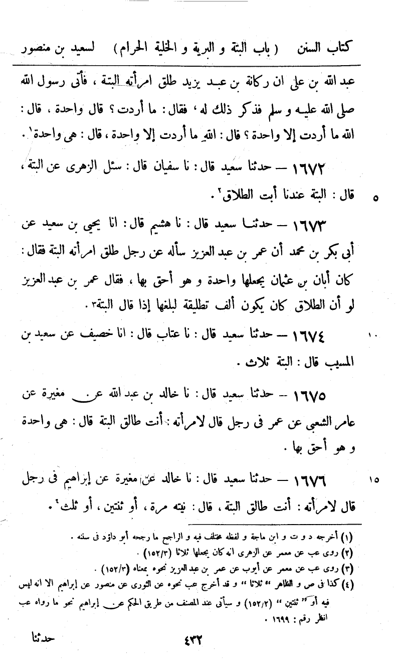 1673 - حَدَّثَنَا سَعِيدٌ قَالَ: نا هُشَيْمٌ، قَالَ: أنا يَحْيَى بْنُ سَعِيدٍ، عَنْ أَبِي بَكْرِ بْنِ مُحَمَّدٍ، أَنَّ عُمَرَ بْنَ عَبْدِ الْعَزِيزِ، سَأَلَهُ عَنْ رَجُلٍ طَلَّقَ امْرَأَتَهُ الْبَتَّةَ، فَقَالَ: كَانَ أَبَانُ بْنُ عُثْمَانَ يَجْعَلُهَا وَاحِدَةً، وَهُوَ أَحَقُّ بِهَا. فَقَالَ عُمَرُ بْنُ عَبْدِ الْعَزِيزِ: «§لَوْ أَنَّ الطَّلَاقَ كَانَ يَكُونُ أَلْفَ تَطْلِيقَةٍ، لَبَلَغَهَا إِذَا قَالَ الْبَتَّةَ»