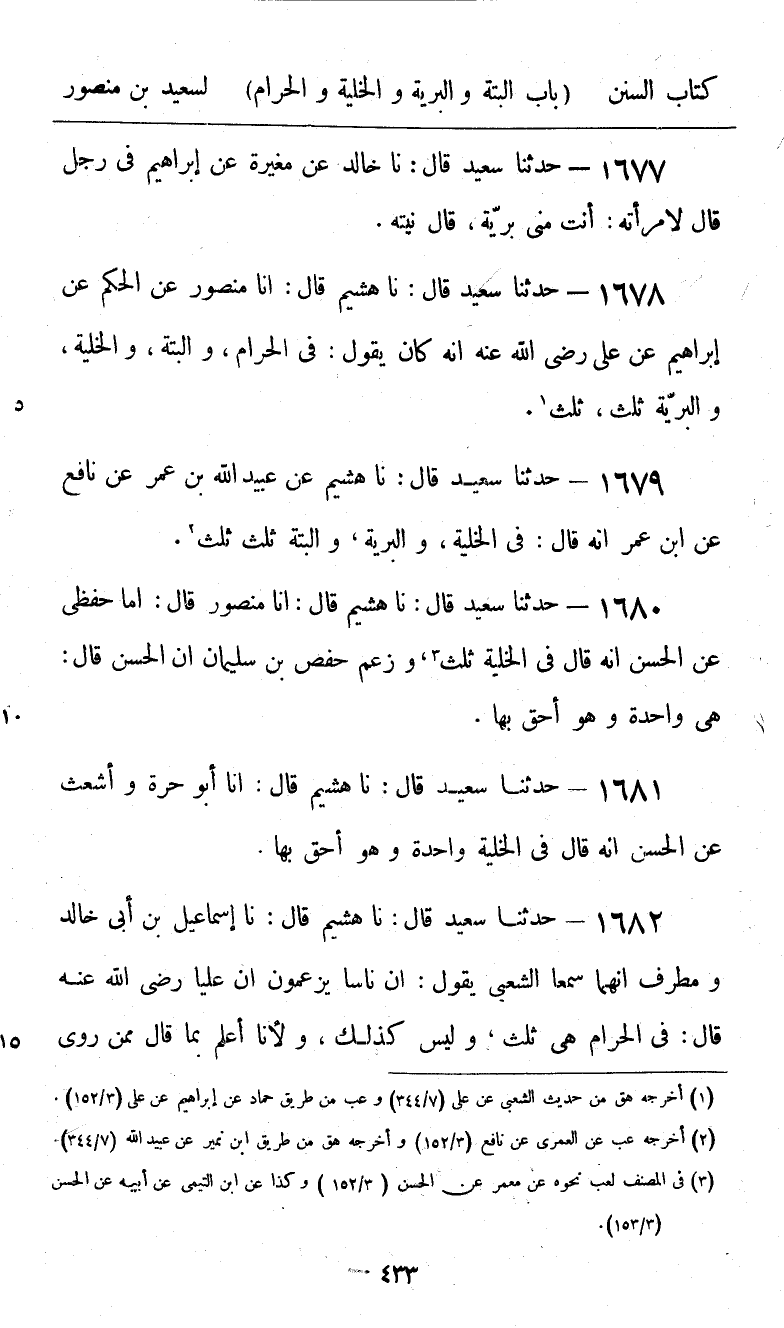1678 - حَدَّثَنَا سَعِيدٌ قَالَ: نا هُشَيْمٌ، قَالَ: نا مَنْصُورٌ، عَنِ الْحَكَمِ، عَنْ إِبْرَاهِيمَ، عَنْ عَلِيٍّ، رَضِيَ اللَّهُ عَنْهُ أَنَّهُ كَانَ يَقُولُ فِي §الْحَرَامِ، وَالْبَتَّةِ، وَالْخَلِيَّةِ، وَالْبَرِيَّةِ: ثَلَاثٌ، ثَلَاثٌ "