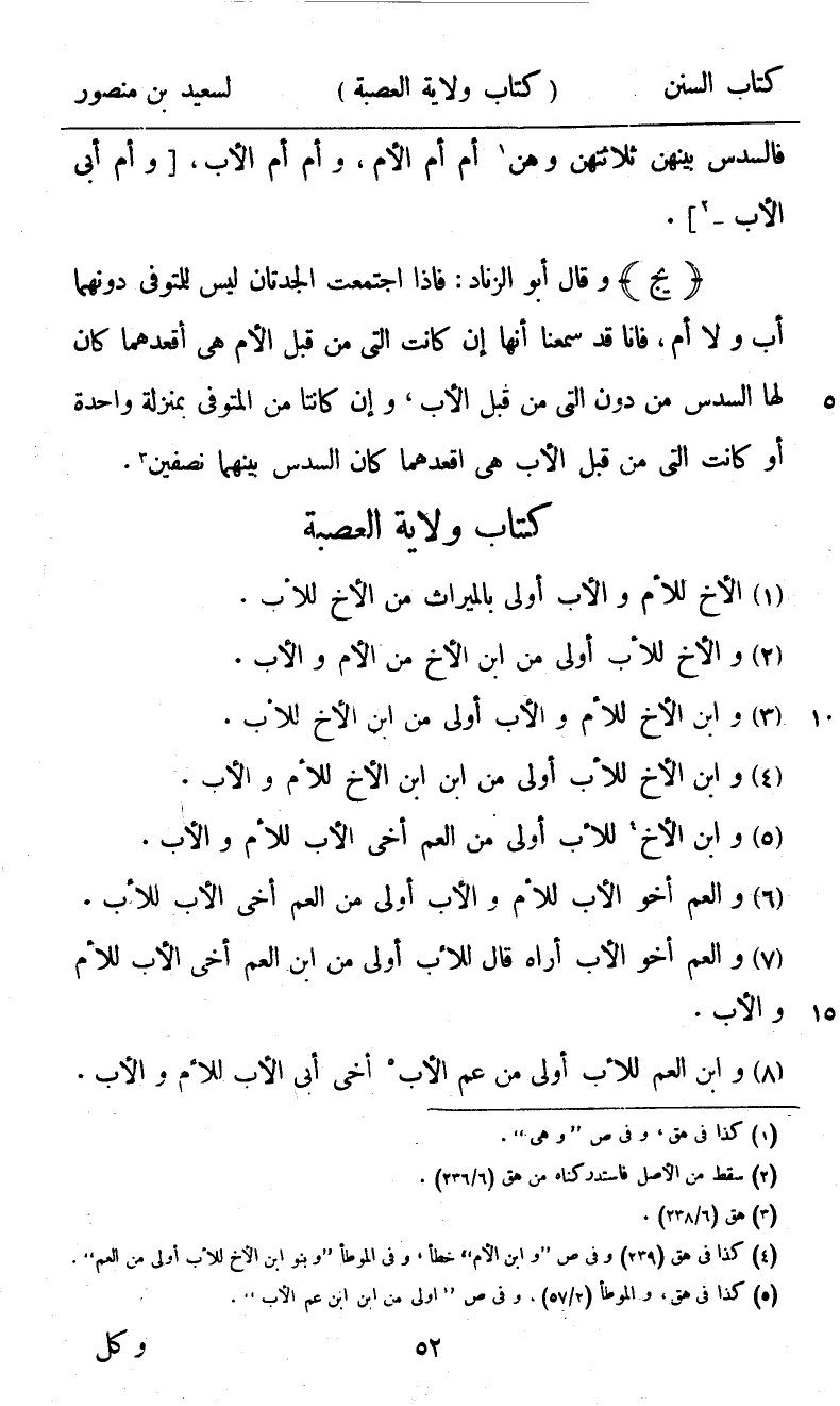 9 - وَكُلُّ مَا سُئِلْتَ عَنْهُ مِنْ مِيرَاثِ الْعَصَبَةِ فَإِنَّهَا عَلَى نَحْوِ هَذَا، مَا سُئِلْتَ عَنْهُ مِنْ ذَلِكَ فَانْسِبِ الْمُتَوَفَّى وَانْسِبْ مَنْ يُنَازِعُ فِي الْوَلَايَةِ مِنْ عَصَبَتِهِ، فَإِنْ وَجَدْتَ مِنْهُمْ أَحَدًا يَلْقَى الْمُتَوَفَّى إِلَى أَبٍ لَا يَلْقَاهُ مَنْ سِوَاهُ مِنْهُمْ إِلَّا إِلَى أَبٍ فَوْقَ ذَلِكَ، فَاجْعَلِ الْمِيرَاثَ لِلَّذِي يَلْقَاهُ إِلَى الْأَبِ الْأَدْنَى دُونَ الْآخَرِينَ، وَإِذَا وَجَدْتَهُمْ يَلْقَوْنَهُ كُلُّهُمْ إِلَى أَبٍ وَاحِدٍ يَجْمَعُهُمْ جَمِيعًا، فَانْظُرْ أَقْعَدَهُمْ فِي النَّسَبِ، فَإِنْ كَانَ ابْنُ أَبٍ قَطُّ فَاجْعَلِ الْمِيرَاثَ لَهُ دُونَ الْأَطْرَافِ، وَإِنْ كَانَ الْأَطْرَافُ مِنْ أُمٍّ وَأَبٍ، فَإِنْ وَجَدْتَهُمْ مُسْتَوِينَ يَنْتَسِبُونَ مِنْ عَدَدِ الْآبَاءِ إِلَى عَدَدٍ وَاحِدٍ حَتَّى يَلْقَوْا نَسَبَ الْمُتَوَفَّى وَكَانُوا كُلُّهُمْ بَنِينَ بَنِي أَبٍ أَوْ بَنِي أَبٍ وَأُمٍّ، فَاجْعَلِ الْمِيرَاثَ بَيْنَهُمْ بِالسَّوَاءِ، وَإِنْ كَانَ وَالِدُ بَعْضِهِمْ أَخَا وَالِدِ ذَلِكَ الْمُتَوَفَّى لِأُمِّهِ وَأَبِيهِ، وَكَانَ وَالِدُ مَنْ سِوَاهُ إِنَّمَا هُوَ أَخُو وَالِدِ ذَلِكَ الْمُتَوَفَّى لِأَبِيهِ قَطُّ، فَإِنَّ الْمِيرَاثَ لِبَنِي الْأَبِ وَالْأُمِّ،