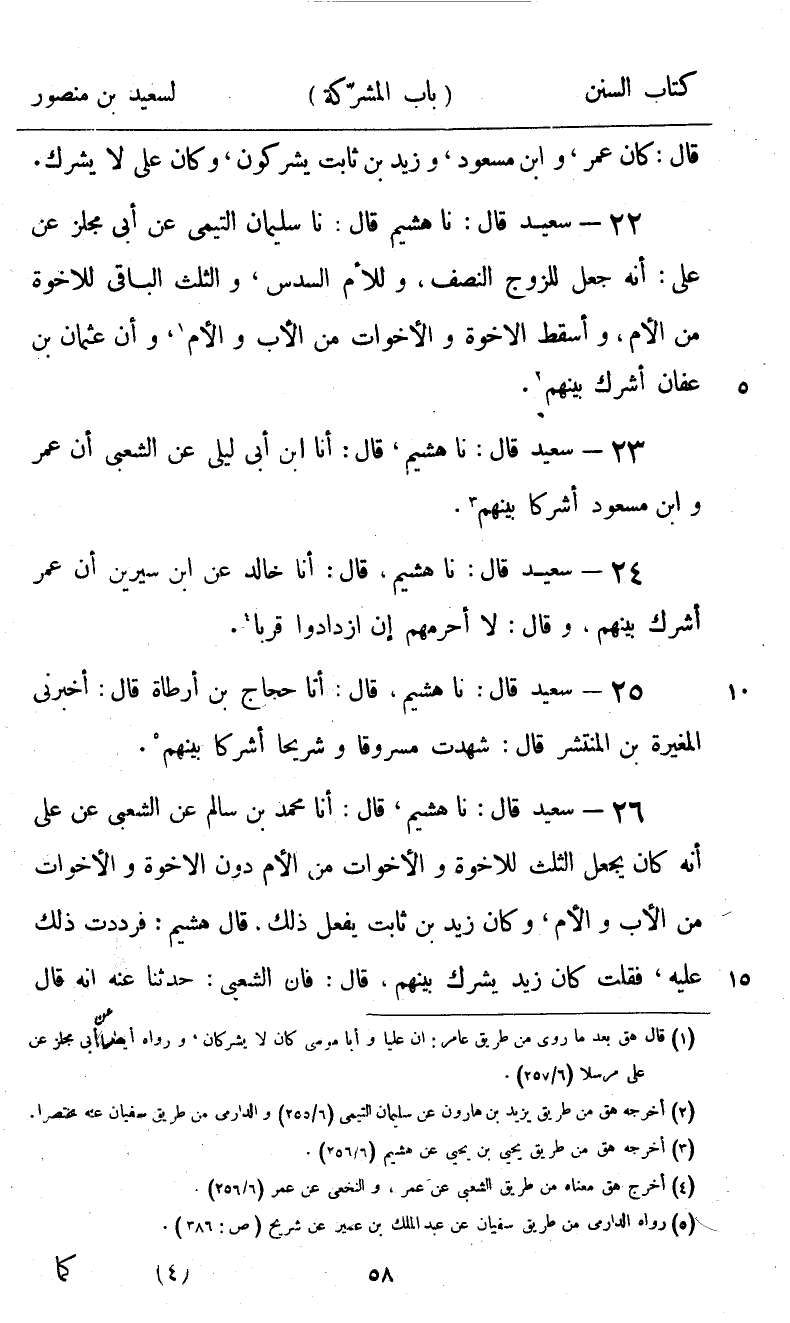 25 - سَعِيدٌ قَالَ: نا هُشَيْمٌ، قَالَ: أنا حَجَّاجُ بْنُ أَرْطَاةَ، قَالَ: أَخْبَرَنِي الْمُغِيرَةُ بْنُ الْمُنْتَشِرِ، قَالَ: «شَهِدْتُ مَسْرُوقًا وَشُرَيْحًا §أَشْرَكَا بَيْنَهُمْ»