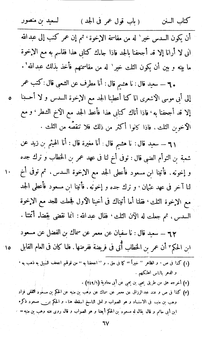 61 - سَعِيدٌ قَالَ: نا هُشَيْمٌ، قَالَ: أنا مُغِيرَةُ، قَالَ: أنا الْهَيْثَمُ بْنُ زَيْدٍ، عَنْ شُعْبَةَ بْنِ التَّوْأَمِ الضَّبِّيِّ، قَالَ: تُوُفِّيَ أَخٌ لَنَا فِي عَهْدِ عُمَرَ بْنِ الْخَطَّابِ، وَتَرَكَ جَدَّهُ وَإِخْوَتَهُ، فَأَتَيْنَا ابْنَ مَسْعُودٍ، فَأَعْطَى الْجَدَّ مَعَ الْإِخْوَةِ السُّدُسَ، ثُمَّ تُوُفِّيَ أَخٌ لَنَا آخَرُ فِي عَهْدِ عُثْمَانَ، وَتَرَكَ جَدَّهُ وَإِخْوَتَهُ، فَأَتَيْنَا ابْنَ مَسْعُودٍ، فَأَعْطَى الْجَدَّ مَعَ الْإِخْوَةِ الثُّلُثَ، فَقُلْنَا: أَمَا أَتَيْنَاكَ فِي أَخِينَا الْأَوَّلِ فَجَعَلْتَ لِلْجَدِّ مَعَ الْإِخْوَةِ السُّدُسَ، ثُمَّ جَعَلْتَ لَهُ الْآنَ الثُّلُثَ؟ فَقَالَ عَبْدُ اللَّهِ: «§إِنَّمَا نَقْضِي بِقَضَاءِ أَئِمَّتِنَا»