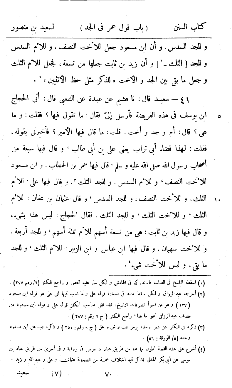 71 - سَعِيدٌ قَالَ: نا هُشَيْمٌ، عَنْ عُبَيْدَةَ، عَنِ الشَّعْبِيِّ، قَالَ: أُتِيَ الْحَجَّاجُ بْنُ يُوسُفَ فِي هَذِهِ الْفَرِيضَةِ، فَأَرْسَلَ إِلَيَّ، فَقَالَ: مَا تَقُولُ فِيهَا؟ فَقُلْتُ: وَمَا هِيَ؟ قَالَ: أُمٌّ وَجَدٌّ وَأُخْتٌ. قُلْتُ: مَا قَالَ فِيهَا الْأَمِيرُ؟ فَأَخْبَرَنِي بِقَوْلِهِ، فَقُلْتُ: لَهَذَا قَضَاءُ أَبِي تُرَابٍ - يَعْنِي عَلِيَّ بْنَ أَبِي طَالِبٍ - وَقَالَ فِيهَا سَبْعَةٌ مِنْ أَصْحَابِ رَسُولِ اللَّهِ صَلَّى اللهُ عَلَيْهِ وَسَلَّمَ: قَالَ فِيهَا عُمَرُ بْنُ الْخَطَّابِ، وَابْنُ مَسْعُودٍ: §لِلْأُخْتِ النِّصْفُ، وَلِلْأُمِّ السُّدُسُ، وَلِلْجَدِّ الثُّلُثُ. وَقَالَ فِيهَا عَلِيٌّ: لِلْأُمِّ الثُّلُثُ، وَلِلْأُخْتِ النِّصْفُ، وَلِلْجَدِّ السُّدُسُ، وَقَالَ عُثْمَانُ بْنُ عَفَّانَ: لِلْأُمِّ الثُّلُثُ، وَلِلْأُخْتِ الثُّلُثُ، وَلِلْجَدِّ الثُّلُثُ، فَقَالَ الْحَجَّاجُ: لَيْسَ هَذَا بِشَيْءٍ، وَقَالَ فِيهَا زَيْدُ بْنُ ثَابِتٍ: هِيَ مِنْ تِسْعَةِ أَسْهُمٍ، لِلْأُمِّ ثَلَاثَةُ أَسْهُمٍ، وَلِلْجَدِّ أَرْبَعَةٌ، وَلِلْأُخْتِ سَهْمَانِ. وَقَالَ فِيهَا ابْنُ عَبَّاسٍ وَابْنُ الزُّبَيْرِ: لِلْأُمِّ الثُّلُثُ، وَلِلْجَدِّ مَا بَقِيَ، وَلَيْسَ لِلْأُخْتِ شَيْءٌ