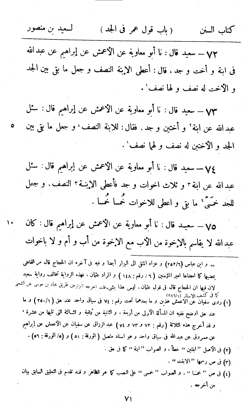 74 - سَعِيدٌ قَالَ: نا أَبُو مُعَاوِيَةَ، عَنِ الْأَعْمَشِ، عَنْ إِبْرَاهِيمَ، قَالَ: سُئِلَ عَبْدُ اللَّهِ عَنِ ابْنَةٍ وَثَلَاثِ أَخَوَاتٍ وَجَدٍّ «§فَأَعْطَى الِابْنَةَ النِّصْفَ، وَجَعَلَ لِلْجَدِّ خُمْسَيْ مَا بَقِيَ، وَأَعْطَى لِلْأَخَوَاتِ خُمْسًا خُمْسًا»