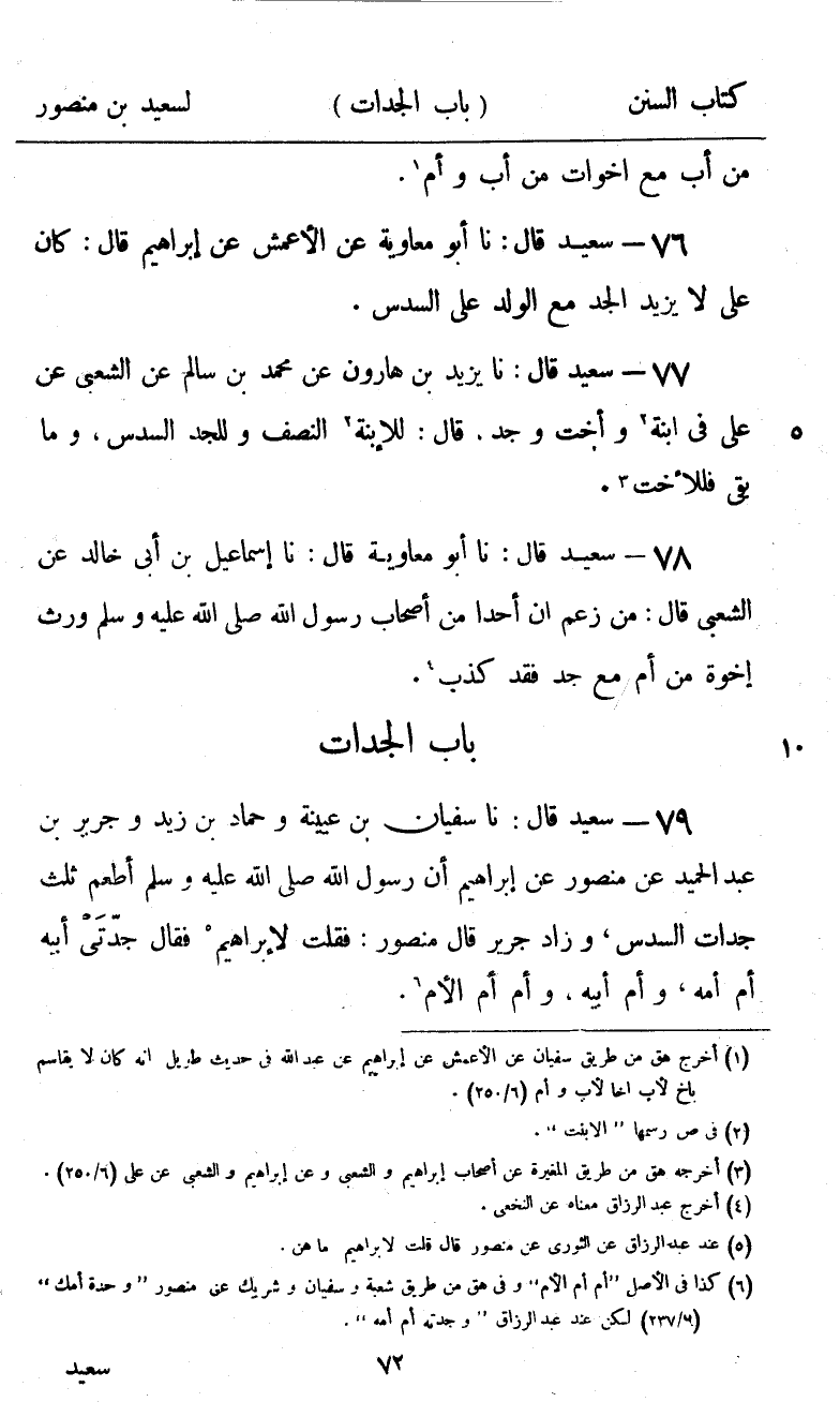 79 - سَعِيدٌ قَالَ: نا سُفْيَانُ بْنُ عُيَيْنَةَ، وَحَمَّادُ بْنُ زَيْدٍ، وَجَرِيرُ بْنُ عَبْدِ الْحَمِيدِ، عَنْ مَنْصُورٍ، عَنْ إِبْرَاهِيمَ، أَنَّ رَسُولَ اللَّهِ صَلَّى اللهُ عَلَيْهِ وَسَلَّمَ «§أَطْعَمَ ثَلَاثَ جَدَّاتٍ السُّدُسَ» وَزَادَ جَرِيرٌ: قَالَ مَنْصُورٌ: فَقُلْتُ لِإِبْرَاهِيمَ، فَقَالَ: جَدَّتَيْ أَبِيهِ أُمَّ أُمِّهِ، وَأُمَّ أَبِيهِ، وَأُمَّ أُمِّ الْأُمِّ "