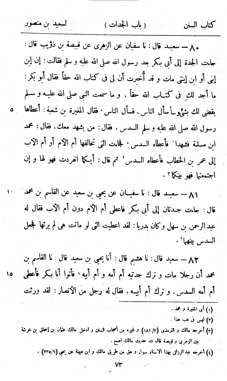 80 - سَعِيدٌ قَالَ: نا سُفْيَانُ، عَنِ الزُّهْرِيِّ، عَنْ قَبِيصَةَ بْنِ ذُؤَيْبٍ، قَالَ: جَاءَتِ الْجَدَّةُ إِلَى أَبِي بَكْرٍ بَعْدَ رَسُولِ اللَّهِ صَلَّى اللهُ عَلَيْهِ وَسَلَّمَ، فَقَالَتْ: إِنَّ ابْنَ ابْنِي - أَوِ ابْنَ ابْنَتِي - مَاتَ، وَقَدْ أُخْبِرْتُ أَنَّ لِي فِي كِتَابِ اللَّهِ حَقًّا. فَقَالَ أَبُو بَكْرٍ: مَا أَجِدُ لَكِ فِي كِتَابِ اللَّهِ حَقًّا، وَمَا سَمِعْتُ النَّبِيَّ صَلَّى اللهُ عَلَيْهِ وَسَلَّمَ يَقْضِي لَكِ بِشَيْءٍ وَسَأَسْأَلُ النَّاسَ. فَسَأَلَ النَّاسَ، فَقَالَ الْمُغِيرَةُ بْنُ شُعْبَةَ: §أَعْطَاهَا رَسُولُ اللَّهِ صَلَّى اللهُ عَلَيْهِ وَسَلَّمَ السُّدُسَ. فَقَالَ: مَنْ يَشْهَدُ مَعَكَ؟ فَقَالَ: مُحَمَّدُ بْنُ مَسْلَمَةَ. فَشَهِدَا؛ فَأَعْطَاهَا السُّدُسَ، فَجَاءَتِ الَّتِي تُخَالِفُهَا أُمُّ الْأُمِّ أَوْ أُمُّ الْأَبِ إِلَى عُمَرَ بْنِ الْخَطَّابِ، فَأَعْطَاهَا السُّدُسَ، ثُمَّ قَالَ: أَيُّكُمَا انْفَرَدَتْ فَهُوَ لَهَا، وَإِنِ اجْتَمَعْتُمَا فَهُوَ بَيْنَكُمَا