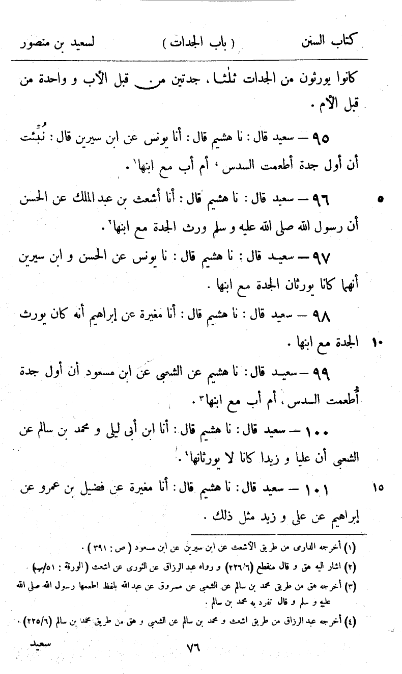 95 - سَعِيدٌ قَالَ: نا هُشَيْمٌ، قَالَ: أنا يُونُسُ، عَنِ ابْنِ سِيرِينَ، قَالَ: نُبِّئْتُ «§أَنَّ أَوَّلَ، جَدَّةٍ أُطْعِمَتِ السُّدُسَ أُمُّ أَبٍ مَعَ ابْنِهَا»