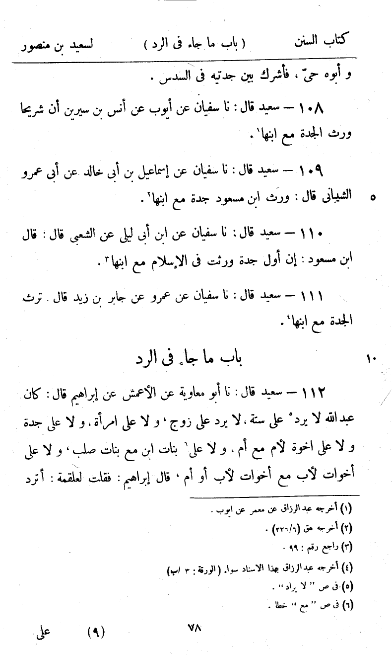 110 - سَعِيدٌ قَالَ: نا سُفْيَانُ، عَنِ ابْنِ أَبِي لَيْلَى، عَنِ الشَّعْبِيِّ، قَالَ: قَالَ ابْنُ مَسْعُودٍ: «§إِنَّ أَوَّلَ جَدَّةٍ وُرِّثَتْ فِي الْإِسْلَامِ مَعَ ابْنِهَا»