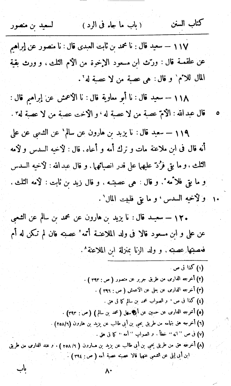 117 - سَعِيدٌ قَالَ: نا مُحَمَّدُ بْنُ ثَابِتٍ الْعَبْدِيُّ، قَالَ: نا مَنْصُورٌ، عَنْ إِبْرَاهِيمَ، عَنْ عَلْقَمَةَ، قَالَ: وَرَّثَ ابْنُ مَسْعُودٍ الْإِخْوَةَ مِنَ الْأُمِّ الثُّلُثَ، وَوَرَّثَ بَقِيَّةَ الْمَالِ لِلْأُمِّ، وَقَالَ: «§هِيَ عَصَبَةُ مَنْ لَا عَصَبَةَ لَهُ»