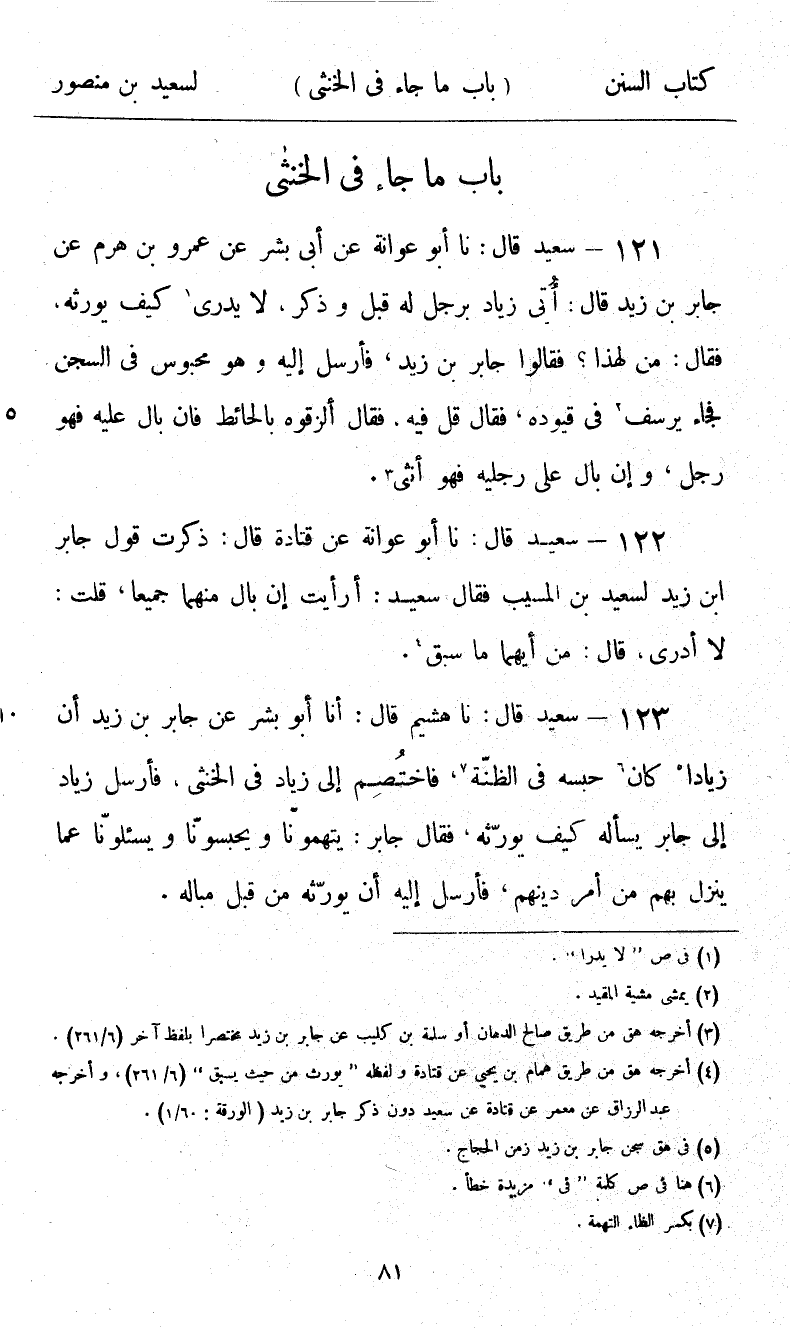 123 - سَعِيدٌ قَالَ: نا هُشَيْمٌ، قَالَ: أنا أَبُو بِشْرٍ، عَنْ جَابِرِ بْنِ زَيْدٍ، أَنَّ زِيَادًا، كَانَ حَبَسَهُ فِي الظِّنَّةِ، فَاخْتُصِمَ إِلَى زِيَادٍ فِي الْخُنْثَى، فَأَرْسَلَ زِيَادٌ إِلَى جَابِرٍ يَسْأَلُهُ كَيْفَ يُوَرِّثُهُ، فَقَالَ جَابِرٌ: §يَتَّهِمُونَا وَيَحْبِسُونَا، وَيَسْأَلُونَا عَمَّا يَنْزِلُ بِهِمْ مِنْ أَمْرِ دِينِهِمْ. فَأَرْسَلَ إِلَيْهِ أَنْ يُوَرِّثَهُ مِنْ قِبَلِ مَبَالِهِ "