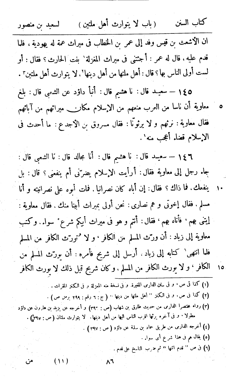 146 - سَعِيدٌ قَالَ: نا هُشَيْمٌ، قَالَ: أنا مُجَالِدٌ، قَالَ: نا الشَّعْبِيُّ، قَالَ: جَاءَ رَجُلٌ إِلَى مُعَاوِيَةَ، فَقَالَ: أَرَأَيْتَ الْإِسْلَامَ يَضُرُّنِي أَمْ يَنْفَعُنِي؟ قَالَ: بَلْ يَنْفَعُكَ، فَمَا ذَاكَ؟ فَقَالَ: إِنَّ أَبَاهُ كَانَ نَصْرَانِيًّا، فَمَاتَ أَبُوهُ عَلَى نَصْرَانِيَّتِهِ وَأَنَا مُسْلِمٌ، فَقَالَ إِخْوَتِي وَهُمْ نَصَارَى: نَحْنُ أَوْلَى بِمِيرَاثِ أَبِينَا مِنْكَ. فَقَالَ مُعَاوِيَةُ: ايتِنِي بِهِمْ. فَأَتَاهُ بِهِمْ، فَقَالَ: " §أَنْتُمْ وَهُوَ فِي مِيرَاثِ أَبِيكُمْ شَرْعٌ سَوَاءٌ