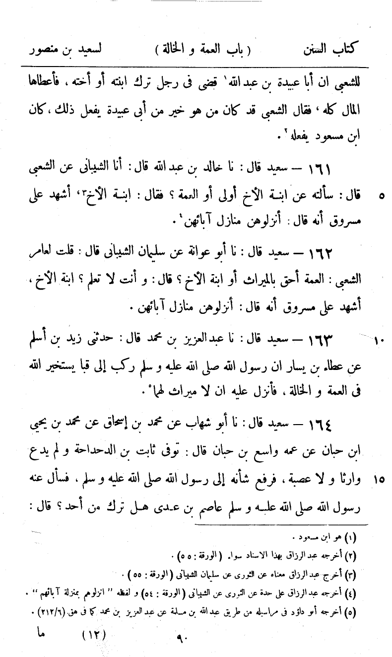 162 - سَعِيدٌ قَالَ: نا أَبُو عَوَانَةَ، عَنْ سُلَيْمَانَ الشَّيْبَانِيِّ، قَالَ: قُلْتُ لِعَامِرٍ الشَّعْبِيِّ: الْعَمَّةُ أَحَقُّ بِالْمِيرَاثِ أَوِ ابْنَةُ الْأَخِ؟ قَالَ: وَأَنْتَ لَا تَعْلَمُ؟ ابْنَةُ الْأَخِ، أَشْهَدُ عَلَى مَسْرُوقٍ أَنَّهُ قَالَ: «§أَنْزِلُوهُنَّ مَنَازِلَ آبَائِهِنَّ»