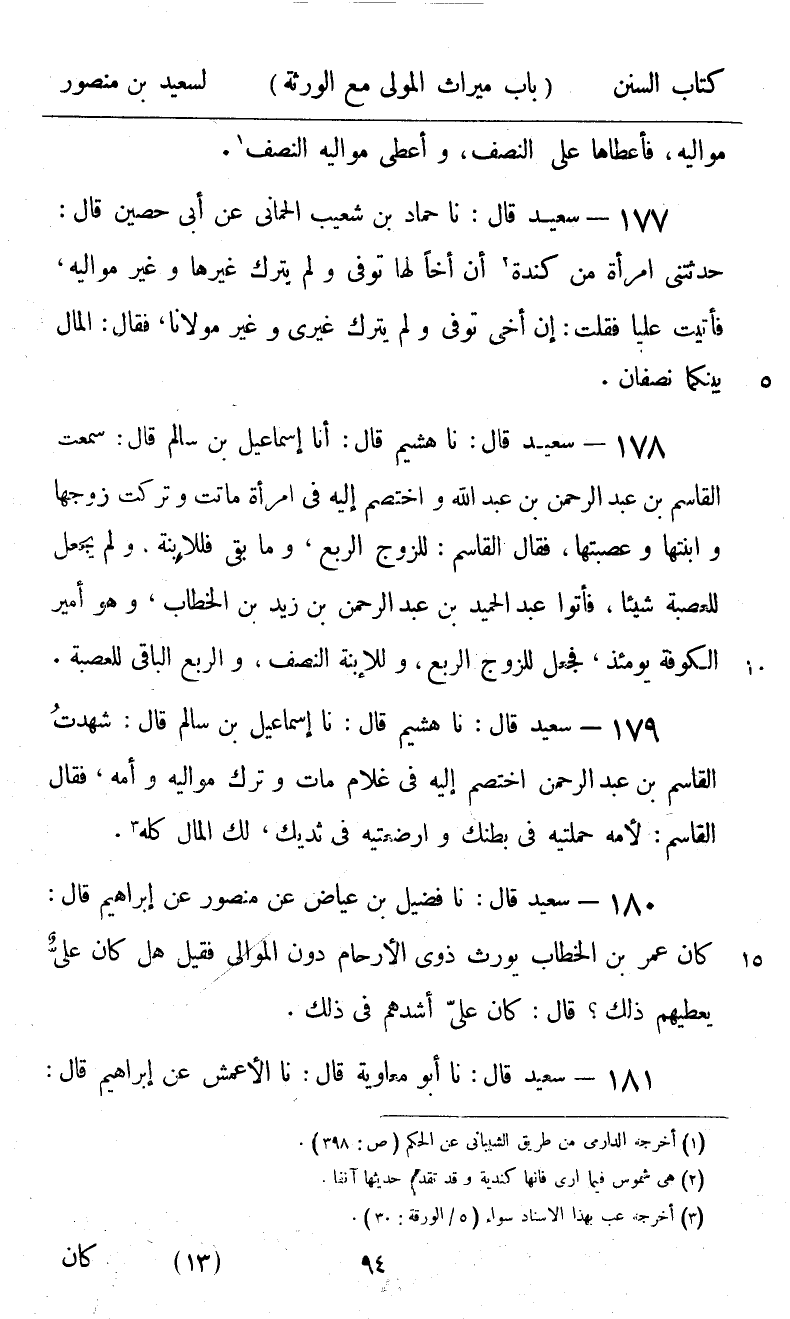 179 - سَعِيدٌ قَالَ: نا هُشَيْمٌ، قَالَ: نا إِسْمَاعِيلُ بْنُ سَالِمٍ، قَالَ: شَهِدْتُ الْقَاسِمَ بْنَ عَبْدِ الرَّحْمَنِ اخْتُصِمَ إِلَيْهِ فِي غُلَامٍ مَاتَ وَتَرَكَ مَوَالِيَهُ وَأُمَّهُ، فَقَالَ الْقَاسِمُ لِأُمِّهِ: «§حَمَلْتِهِ فِي بَطْنِكِ، وَأَرْضَعْتِهِ فِي ثَدْيِكِ، لَكِ الْمَالُ كُلُّهُ»