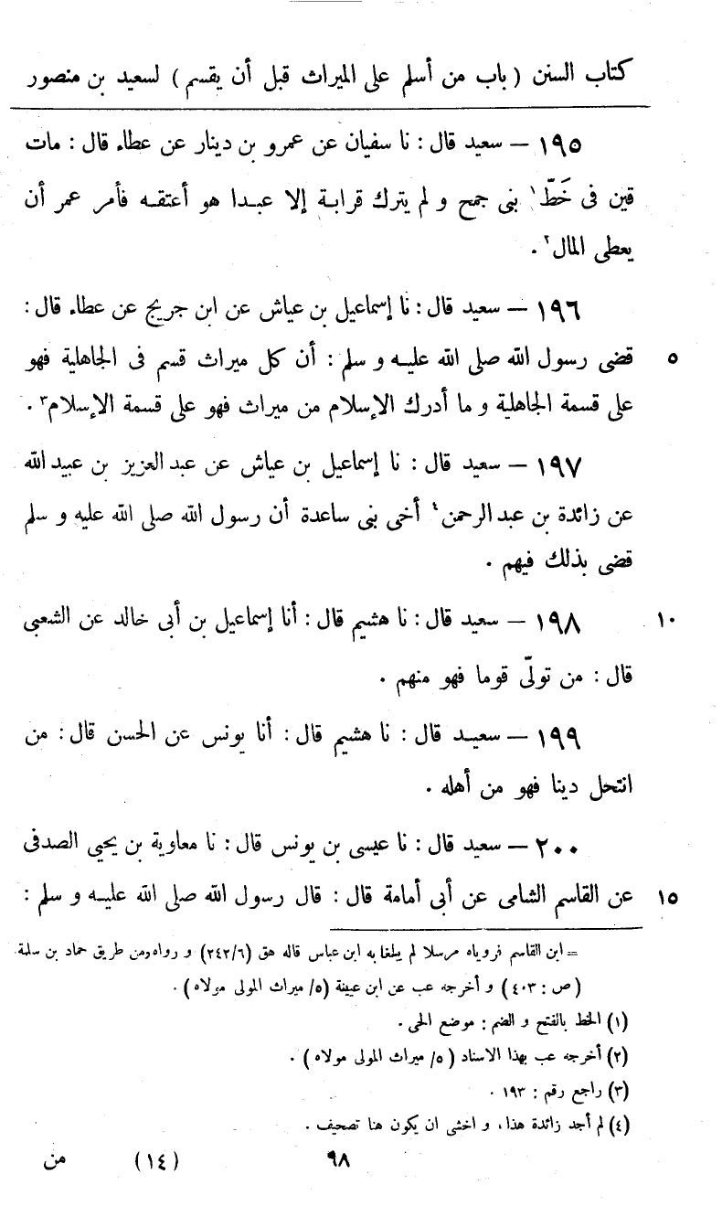 196 - سَعِيدٌ قَالَ: نا إِسْمَاعِيلُ بْنُ عَيَّاشٍ، عَنِ ابْنِ جُرَيْجٍ، عَنْ عَطَاءٍ، قَالَ: قَضَى رَسُولُ اللَّهِ صَلَّى اللهُ عَلَيْهِ وَسَلَّمَ §أَنَّ كُلَّ مِيرَاثٍ قُسِمَ فِي الْجَاهِلِيَّةِ فَهُوَ عَلَى قِسْمَةِ الْجَاهِلِيَّةِ، وَمَا أَدْرَكَ الْإِسْلَامُ مِنْ مِيرَاثٍ فَهُوَ عَلَى قِسْمَةِ الْإِسْلَامِ "