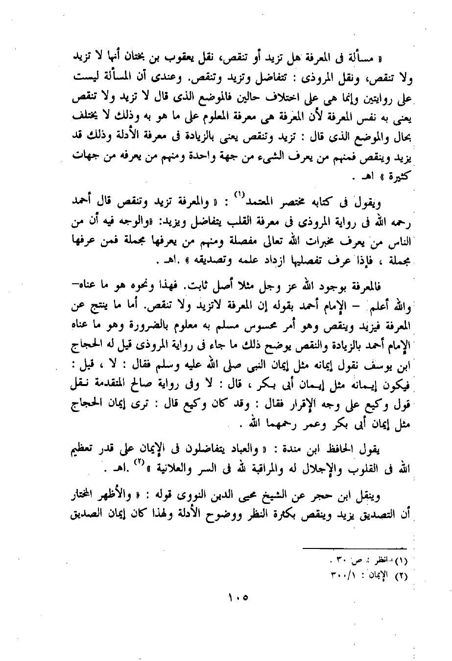 فالمعرفة بوجود اللّه عز وجل مثلا أصل ثابت. فهذا ونحوه هو ما عناه- واللّه أعلم- الإمام أحمد بقوله إن المعرفة لا تزيد ولا تنقص. أما ما ينتج عن المعرفة فيزيد وينقص وهو أمر محسوس مسلم به معلوم بالضرورة وهو ما عناه الإمام أحمد بالزيادة والنقص يوضح ذلك ما جاء فى رواية المروزي قيل له الحجاج ابن يوسف نقول إيمانه مثل إيمان النبي صلى اللّه عليه وسلم فقال: لا، قيل: