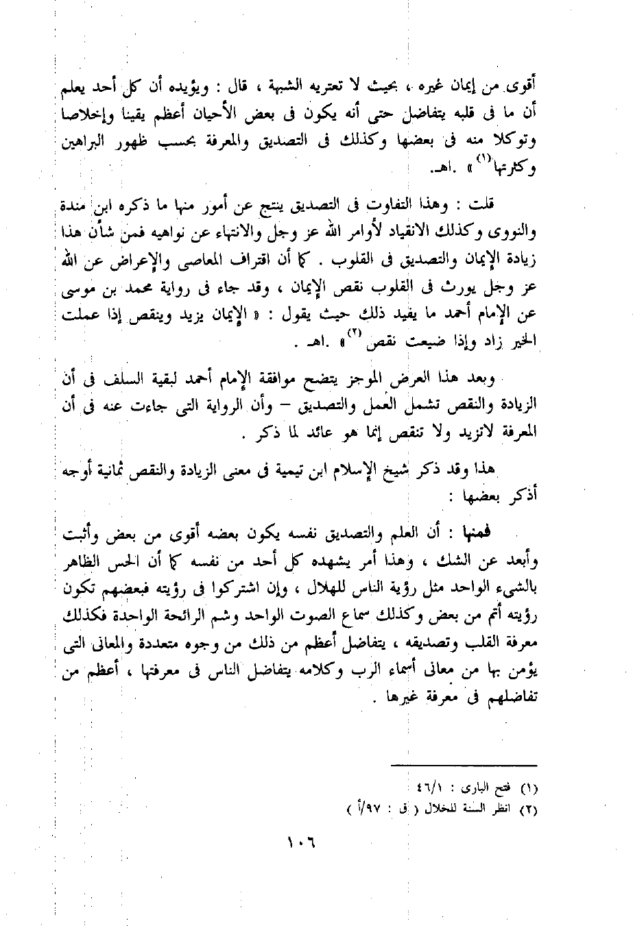 قلت: وهذا التفاوت فى التصديق ينتج عن أمور منها ما ذكره ابن مندة والنووى وكذلك الانقياد لأوامر اللّه عز وجل والانتهاء عن نواهيه فمن شأن هذا زيادة الإيمان والتصديق فى القلوب. كما أن اقتراف المعاصى والإعراض عن اللّه عز وجل يورث فى القلوب نقص الإيمان، وقد جاء فى رواية محمد بن موسى عن الإمام أحمد ما يفيد ذلك حيث يقول: «الإيمان يزيد وينقص إذا عملت الخير زاد وإذا ضيعت نقص «2»». اه.