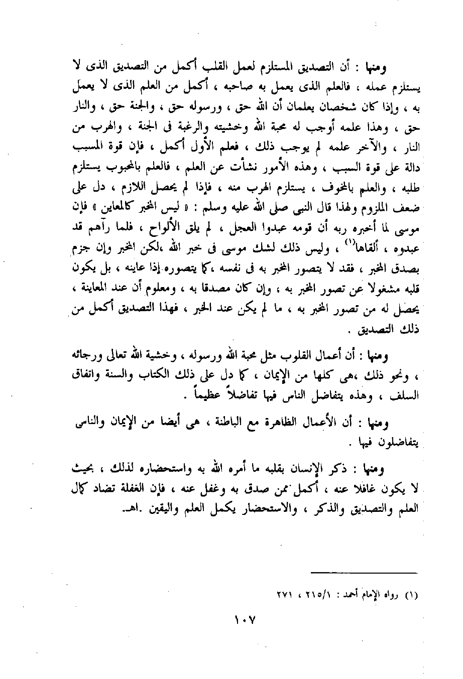 ومنها: أن التصديق المستلزم لعمل القلب أكمل من التصديق الّذي لا يستلزم عمله، فالعلم الّذي يعمل به صاحبه، أكمل من العلم الّذي لا يعمل به، وإذا كان شخصان يعلمان أن اللّه حق، ورسوله حق، والجنة حق، والنار حق، وهذا علمه أوجب له محبة اللّه وخشيته والرغبة فى الجنة، والهرب من النار، والآخر علمه لم يوجب ذلك، فعلم الأول أكمل، فإن قوة المسبب دالة على قوة السبب، وهذه الأمور نشأت عن العلم، فالعلم بالمحبوب يستلزم طلبه، والعلم بالمخوف، يستلزم الهرب منه، فإذا لم يحصل اللازم، دل على ضعف الملزوم ولهذا قال النبي صلى اللّه عليه وسلم: «ليس المخبر كالمعاين» فإن موسى لما أخبره ربه أن قومه عبدوا العجل، لم يلق الألواح، فلما رآهم قد عبدوه، ألقاها «1»، وليس ذلك لشك موسى فى خبر اللّه، لكن المخبر وإن جزم بصدق المخبر، فقد لا يتصور المخبر به فى نفسه، كما يتصوره إذا عاينه، بل يكون قلبه مشغولا عن تصور المخبر به، وإن كان مصدقا به، ومعلوم أن عند المعاينة، يحصل له من تصور المخبر به، ما لم يكن عند الخبر، فهذا التصديق أكمل من ذلك التصديق.