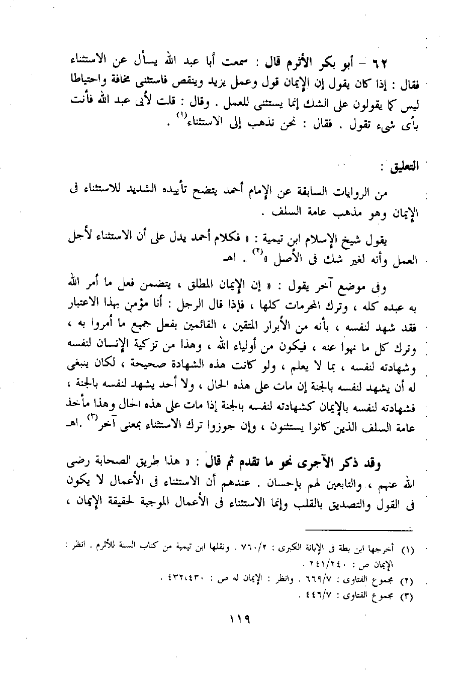 62 - أبو بكر الأثرم قال: سمعت أبا عبد اللّه يسأل عن الاستثناء فقال: إذا كان يقول إن الإيمان قول وعمل يزيد وينقص فاستثنى مخافة واحتياطا ليس كما يقولون على الشك إنما يستثنى للعمل. وقال: قلت لأبى عبد اللّه فأنت بأى شيء تقول. فقال: نحن نذهب إلى الاستثناء «1».