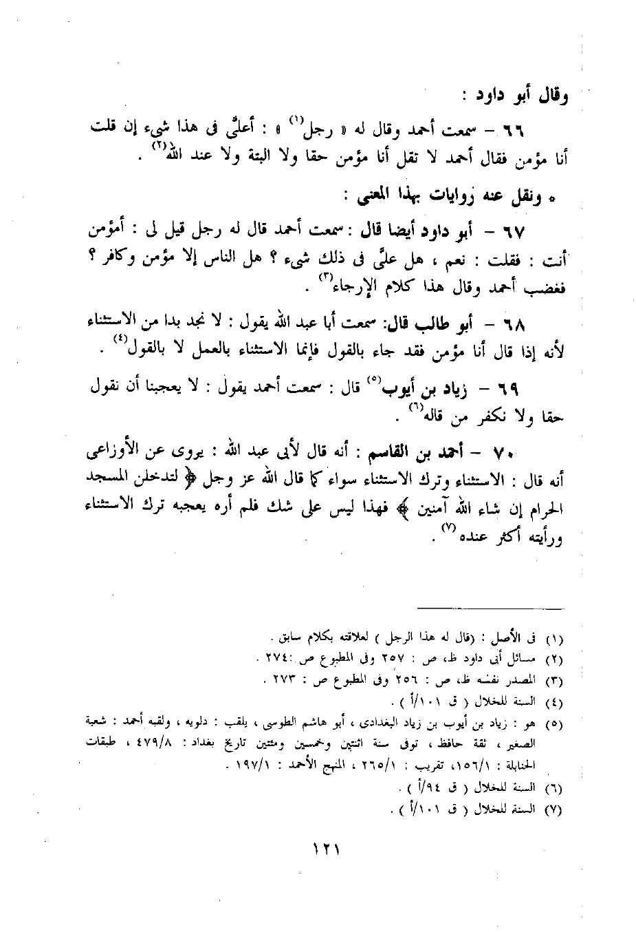 67 - أبو داود أيضا قال: سمعت أحمد قال له رجل قيل لى: أ مؤمن أنت: فقلت: نعم، هل عليّ فى ذلك شيء؟ هل الناس إلا مؤمن وكافر؟