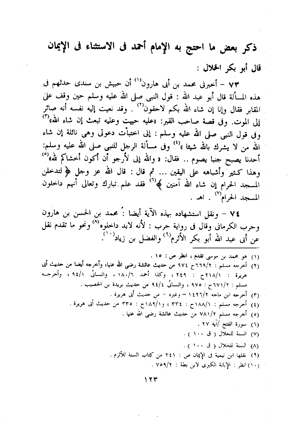 73 - أخبرنى محمد بن أبى هارون «1» أن حبيش بن سندى حدثهم فى هذه المسألة قال أبو عبد اللّه: قول النبي صلى اللّه عليه وسلم حين وقف على المقابر فقال وإنا إن شاء اللّه بكم لاحقون «2». وقد نعيت إليه نفسه أنه صائر إلى الموت. وفى قصة صاحب القبر: «عليه حييت وعليه تبعث إن شاء اللّه» «3» وفى قول النبي صلى اللّه عليه وسلم: إنى اختبأت دعوتى وهى نائلة إن شاء اللّه من لا يشرك باللّه شيئا» «4» وفى مسألة الرجل للنبى صلى اللّه عليه وسلم: