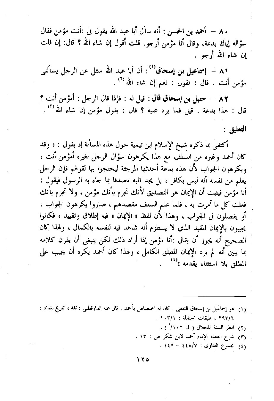 اكتفى بما ذكره شيخ الإسلام ابن تيمية حول هذه المسألة إذ يقول: «و قد كان أحمد وغيره من السلف مع هذا يكرهون سؤال الرجل لغيره أ مؤمن أنت، ويكرهون الجواب لأن هذه بدعة أحدثها المرجئة ليحتجوا بها لقولهم فإن الرجل يعلم من نفسه أنه ليس بكافر، بل يجد قلبه مصدقا بما جاء به الرسول فيقول: