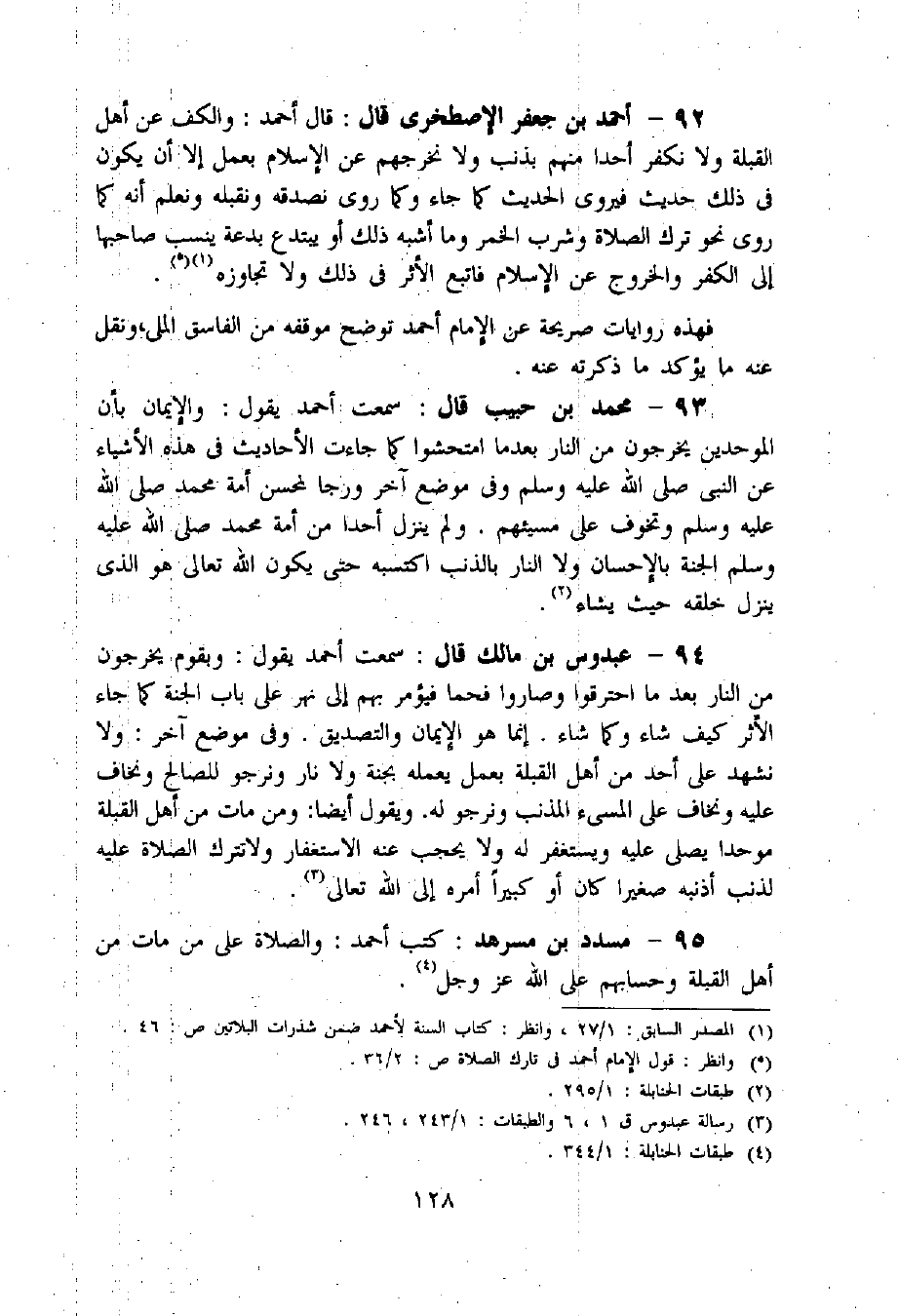 93 - محمد بن حبيب قال: سمعت أحمد يقول: والإيمان بأن الموحدين يخرجون من النار بعد ما امتحشوا كما جاءت الأحاديث فى هذه الأشياء عن النبي صلى اللّه عليه وسلم وفى موضع آخر ورجا لمحسن أمة محمد صلى اللّه عليه وسلم وتخوف على مسيئهم. ولم ينزل أحدا من أمة محمد صلى اللّه عليه وسلم الجنة بالإحسان ولا النار بالذنب اكتسبه حتى يكون اللّه تعالى هو الّذي ينزل خلقه حيث يشاء «3».