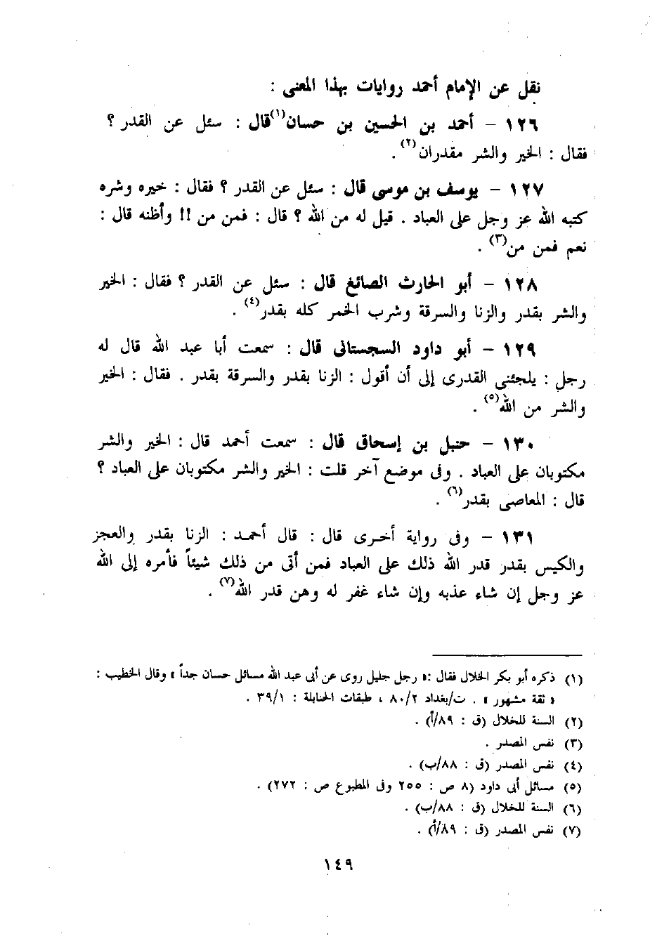 129 - أبو داود السجستانى قال: سمعت أبا عبد اللّه قال له رجل: يلجئنى القدرى إلى أن أقول: الزنا بقدر والسرقة بقدر. فقال:- الخير والشر من اللّه «5».