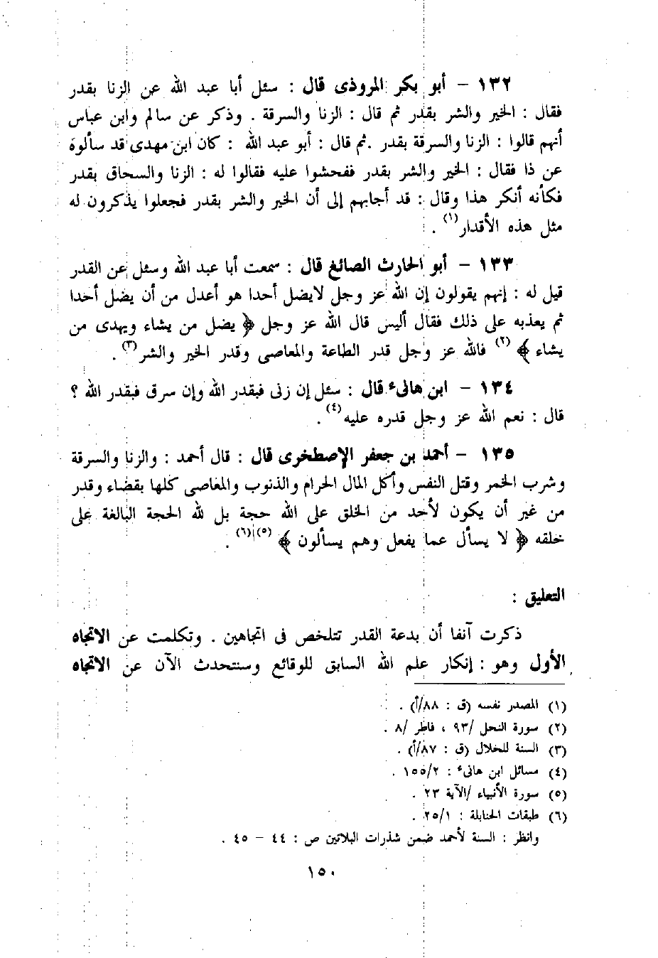 135 - أحمد بن جعفر الإصطخرى قال: قال أحمد: والزنا والسرقة وشرب الخمر وقتل النفس وأكل المال الحرام والذنوب والمعاصى كلها بقضاء وقدر من غير أن يكون لأحد من الخلق على اللّه حجة بل للّه الحجة البالغة على خلقه لا يُسْئَلُ عَمَّا يَفْعَلُ وهُمْ يُسْئَلُونَ «5» «6»