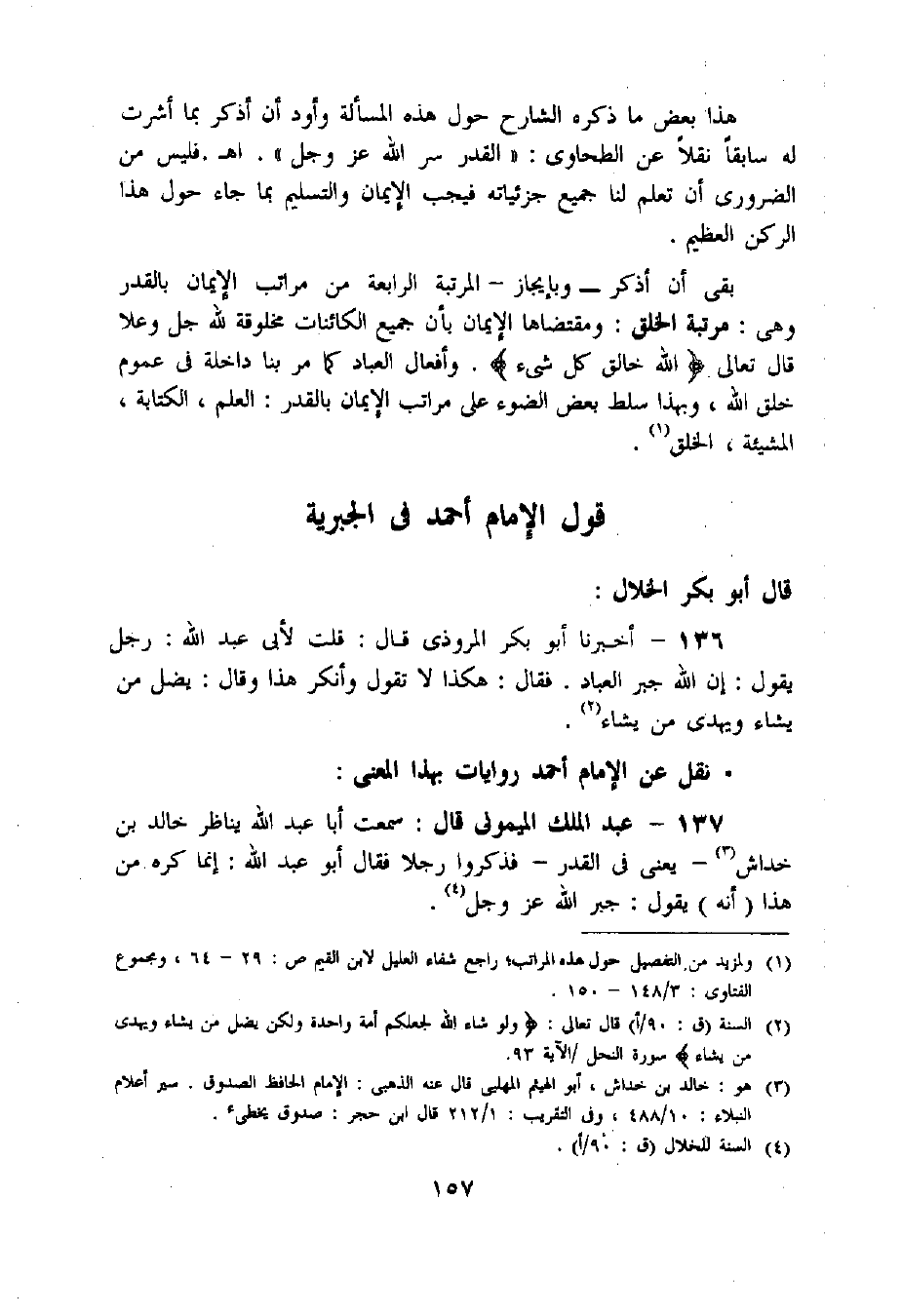 136 - أخبرنا أبو بكر المروزي قال: قلت لأبى عبد اللّه: رجل يقول: إن اللّه جبر العباد. فقال: هكذا لا تقول وأنكر هذا وقال: يضل من يشاء ويهدى من يشاء «2».