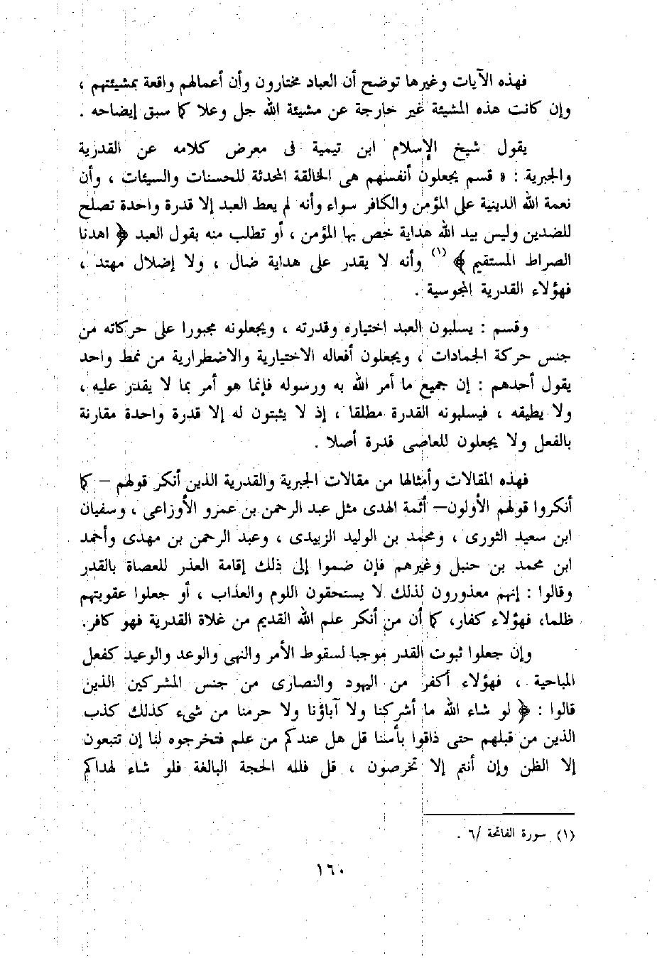 يقول شيخ الإسلام ابن تيمية فى معرض كلامه عن القدرية والجبرية: «قسم يجعلون أنفسهم هى الخالقة المحدثة للحسنات والسيئات، وأن نعمة اللّه الدينية على المؤمن والكافر سواء وأنه لم يعط العبد إلا قدرة واحدة تصلح للضدين وليس بيد اللّه هداية خص بها المؤمن، أو تطلب منه بقول العبد اهْدِنَا الصِّراطَ الْمُسْتَقِيمَ «1» وأنه لا يقدر على هداية ضال، ولا إضلال مهتد، فهؤلاء القدرية المجوسية.