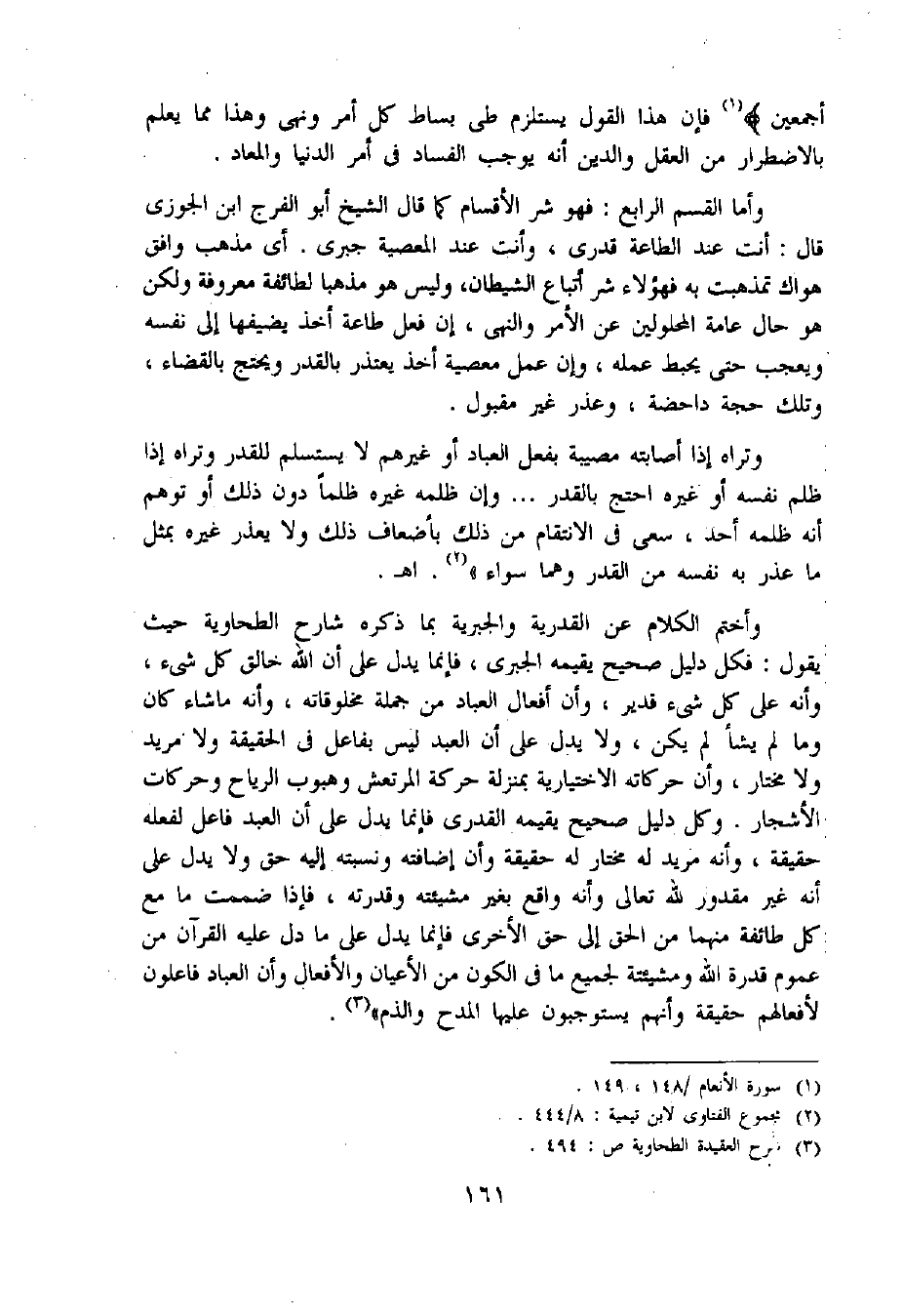 وأختم الكلام عن القدرية والجبرية بما ذكره شارح الطحاوية حيث يقول: فكل دليل صحيح يقيمه الجبرى، فإنما يدل على أن اللّه خالق كل شيء، وأنه على كل شيء قدير، وأن أفعال العباد من جملة مخلوقاته، وأنه ما شاء كان وما لم يشأ لم يكن، ولا يدل على أن العبد ليس بفاعل فى الحقيقة ولا مريد ولا مختار، وأن حركاته الاختيارية بمنزلة حركة المرتعش وهبوب الرياح وحركات الأشجار. وكل دليل صحيح يقيمه القدرى فإنما يدل على أن العبد فاعل لفعله حقيقة، وأنه مريد له مختار له حقيقة وأن إضافته ونسبته إليه حق ولا يدل على أنه غير مقدور للّه تعالى وأنه واقع بغير مشيئته وقدرته، فإذا ضممت ما مع كل طائفة منهما من الحق إلى حق الأخرى فإنما يدل على ما دل عليه القرآن من عموم قدرة اللّه ومشيئته لجميع ما فى الكون من الأعيان والأفعال وأن العباد فاعلون لأفعالهم حقيقة وأنهم يستوجبون عليها المدح والذم» «3».