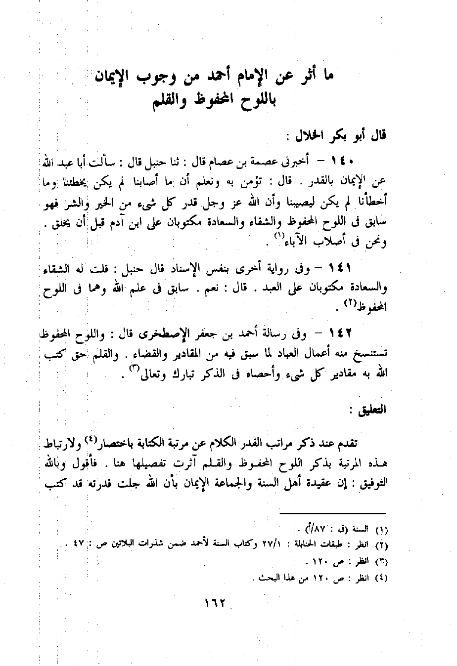 141 - وفى رواية أخرى بنفس الإسناد قال حنبل: قلت له الشقاء والسعادة مكتوبان على العبد. قال: نعم. سابق فى علم اللّه وهما فى اللوح المحفوظ «2».