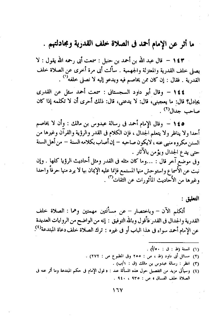 ما أثر عن الإمام أحمد فى الصلاة خلف القدرية ومجادلتهم.