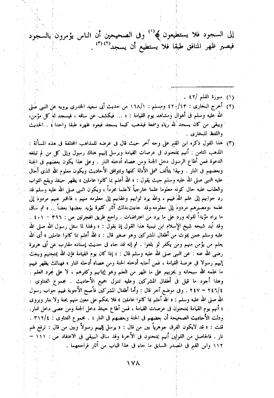 (2) أخرج البخارى: 13/ 420 ومسلم: 1/ 168 من حديث أبى سعيد الخدرى يرويه عن النبي صلى اللّه عليه وسلم فى أهوال ومشاهد يوم القيامة: « ... فيكشف عن ساقه، فيسجد له كل مؤمن، ويبقى من كان يسجد للّه رياء وسمعة فيذهب كيما يسجد فيعود ظهره طبقا واحدا». الحديث واللفظ للبخارى.