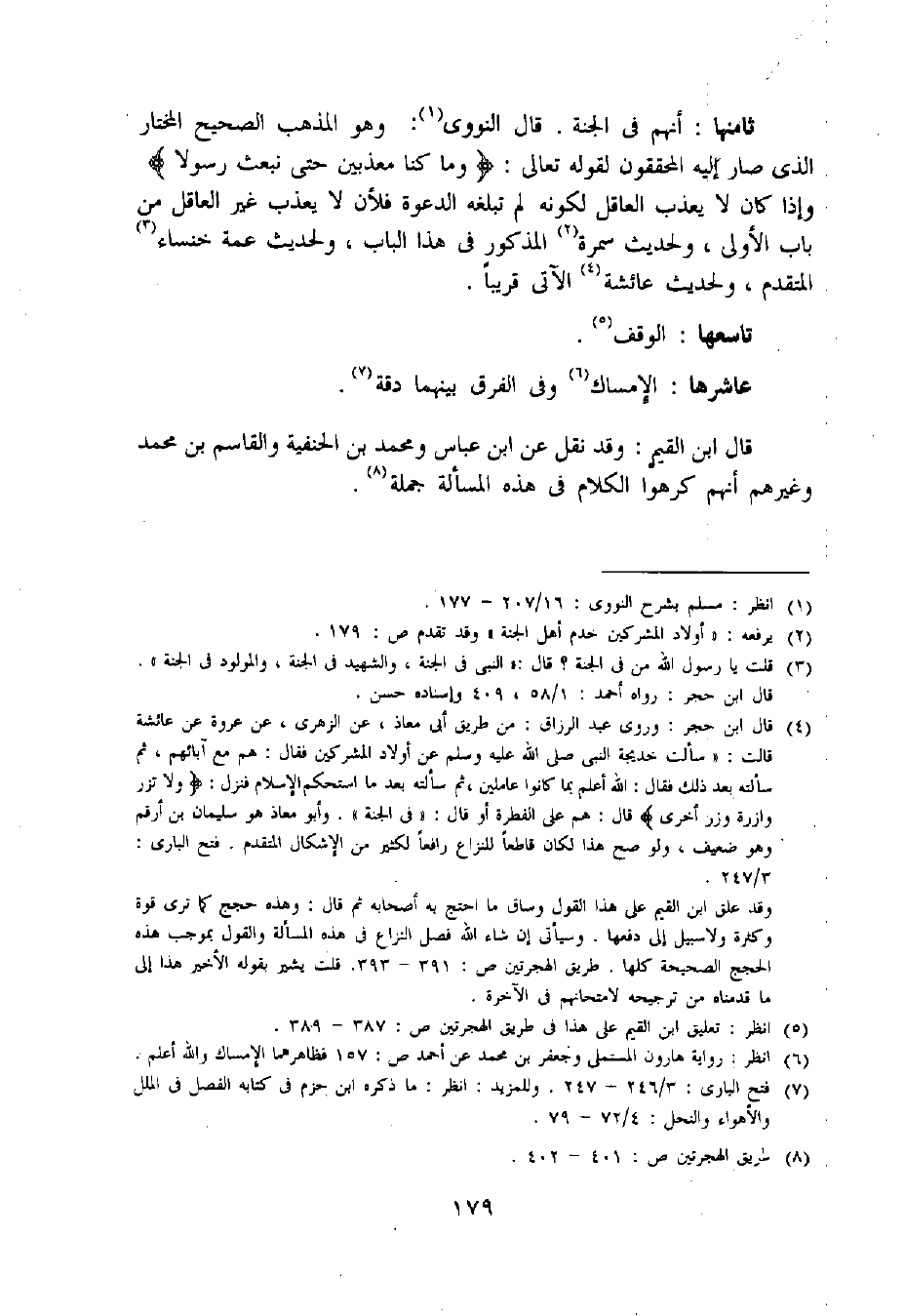 وقد علق ابن القيم على هذا القول وساق ما احتج به أصحابه ثم قال: وهذه حجج كما ترى قوة وكثرة ولا سبيل إلى دفعها. وسيأتى إن شاء اللّه فصل النزاع فى هذه المسألة والقول بموجب هذه الحجج الصحيحة كلها. طريق الهجرتين ص: 391 - 393. قلت يشير بقوله الأخير هذا إلى ما قدمناه من ترجيحه لامتحانهم فى الآخرة.