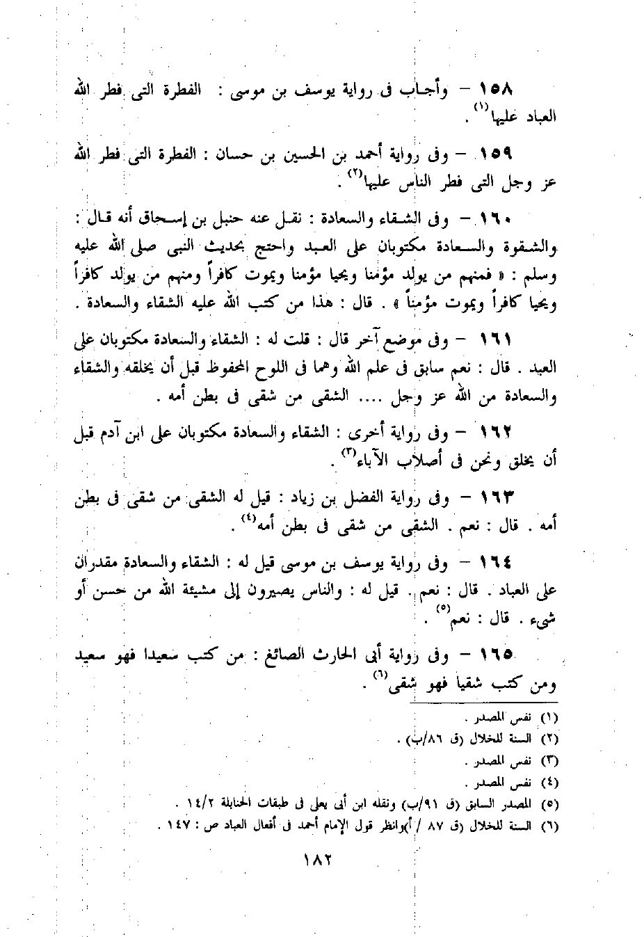 160 - وفى الشقاء والسعادة: نقل عنه حنبل بن إسحاق أنه قال: