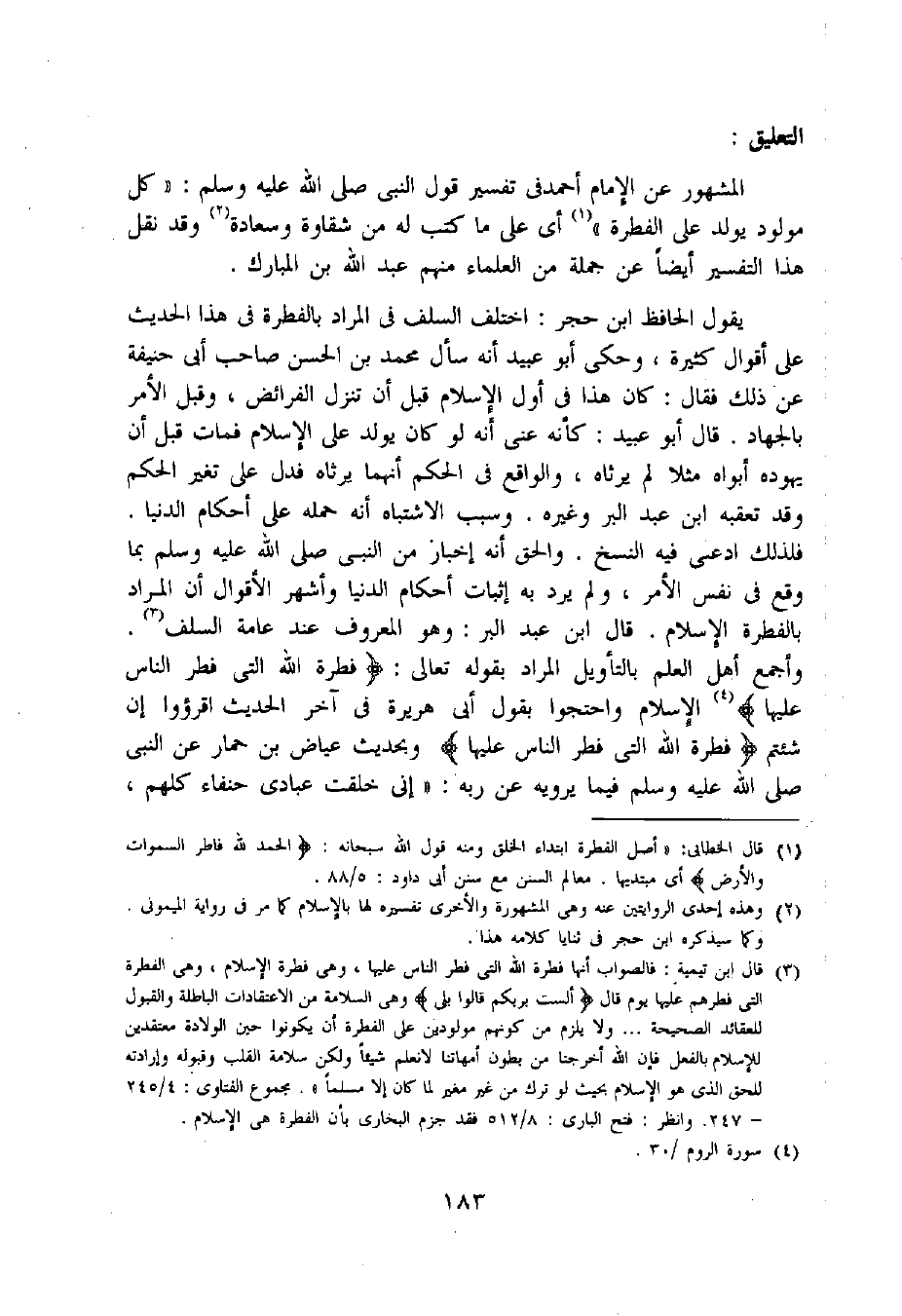 المشهور عن الإمام أحمد فى تفسير قول النبي صلى اللّه عليه وسلم: «كل مولود يولد على الفطرة» «1» أى على ما كتب له من شقاوة وسعادة «2» وقد نقل هذا التفسير أيضا عن جملة من العلماء منهم عبد اللّه بن المبارك.