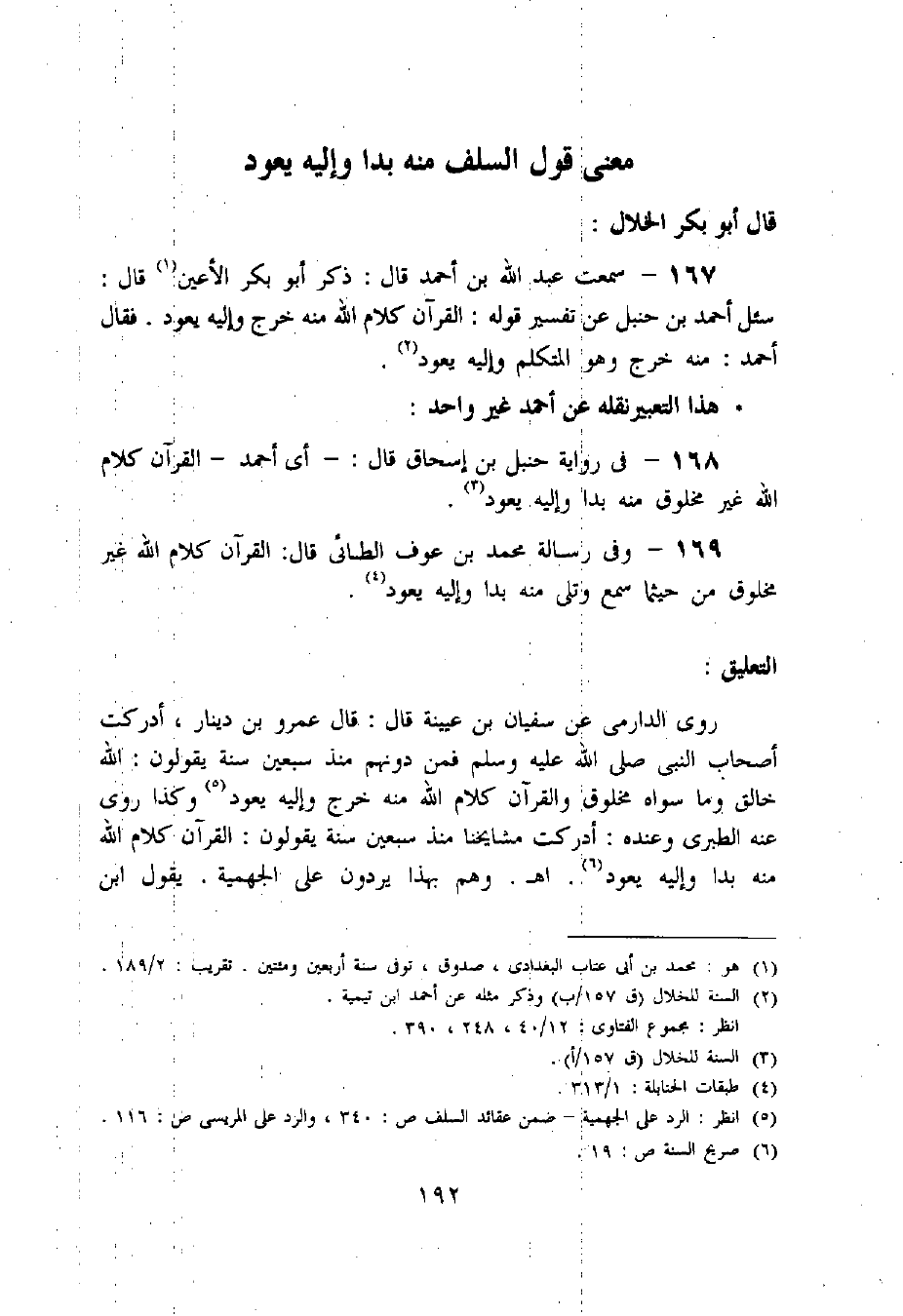 سئل أحمد بن حنبل عن تفسير قوله: القرآن كلام اللّه منه خرج وإليه يعود. فقال أحمد: منه خرج وهو المتكلم وإليه يعود «2».