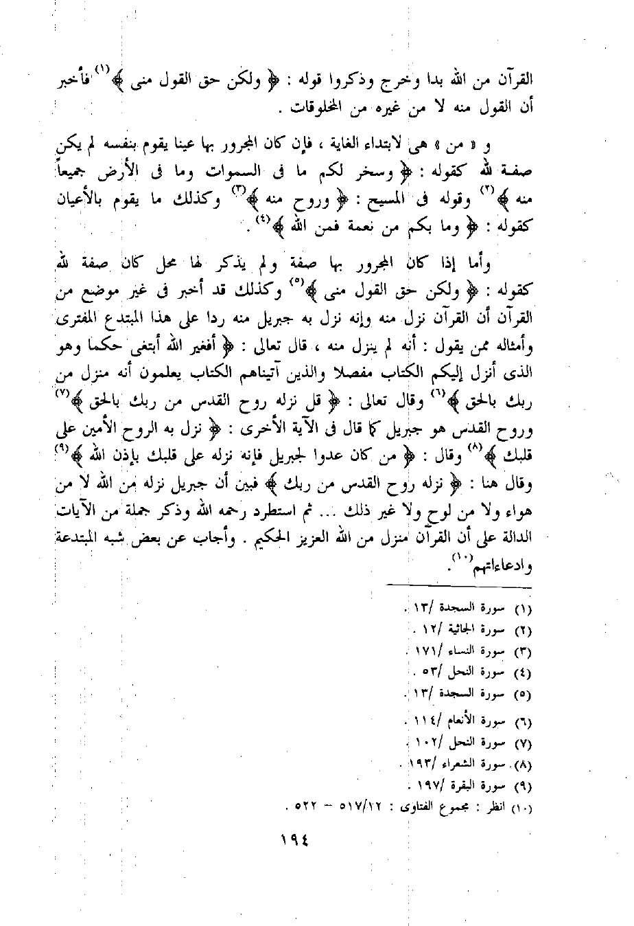 وأما إذا كان المجرور بها صفة ولم يذكر لها محل كان صفة للّه كقوله: ولكِنْ حَقَّ الْقَوْلُ مِنِّي «5» وكذلك قد أخبر فى غير موضع من القرآن أن القرآن نزل منه وإنه نزل به جبريل منه ردا على هذا المبتدع المفترى وأمثاله ممن يقول: أنه لم ينزل منه، قال تعالى: أَ فَغَيْرَ اللَّهِ أَبْتَغِي حَكَماً وهُوَ الَّذِي أَنْزَلَ إِلَيْكُمُ الْكِتابَ مُفَصَّلًا والَّذِينَ آتَيْناهُمُ الْكِتابَ يَعْلَمُونَ أَنَّهُ مُنَزَّلٌ مِنْ رَبِّكَ بِالْحَقِّ «6» وقال تعالى: قُلْ نَزَّلَهُ رُوحُ الْقُدُسِ مِنْ رَبِّكَ بِالْحَقِّ «7» وروح القدس هو جبريل كما قال فى الآية الأخرى: نَزَلَ بِهِ الرُّوحُ الْأَمِينُ عَلى قَلْبِكَ «8» وقال: مَنْ كانَ عَدُوًّا لِجِبْرِيلَ فَإِنَّهُ نَزَّلَهُ عَلى قَلْبِكَ بِإِذْنِ اللَّهِ «9» وقال هنا: نَزَّلَهُ رُوحُ الْقُدُسِ مِنْ رَبِّكَ فبين أن جبريل نزله من اللّه لا من هواء ولا من لوح ولا غير ذلك ... ثم استطرد رحمه اللّه وذكر جملة من الآيات الدالة على أن القرآن منزل من اللّه العزيز الحكيم. وأجاب عن بعض شبه المبتدعة وادعاءاتهم «10».